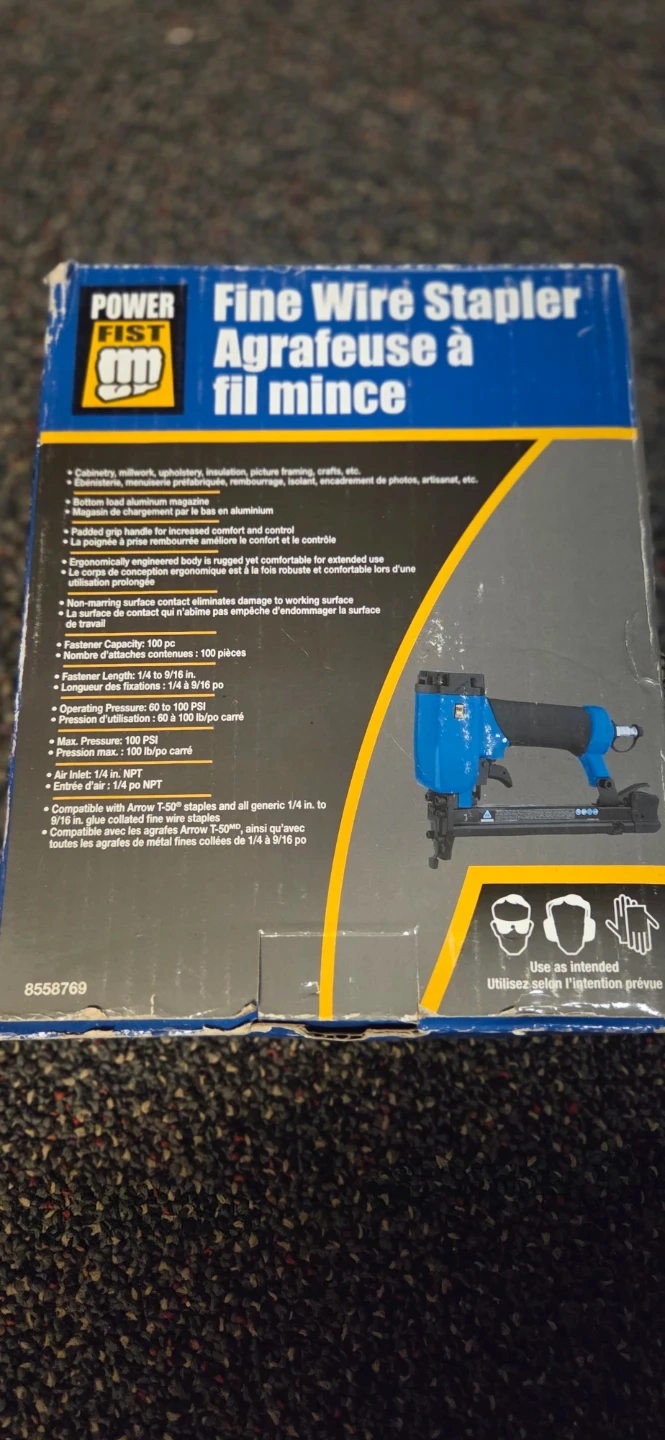 This is a Power Fist fine wire stapler, perfect for upholstery, cabinets, and crafting. It has a 100 pc fastener capacity and operates between 60 to 100 PSI. This tool uses T-50 staples and all generic 1/4 in. to 5/16 in. staples.