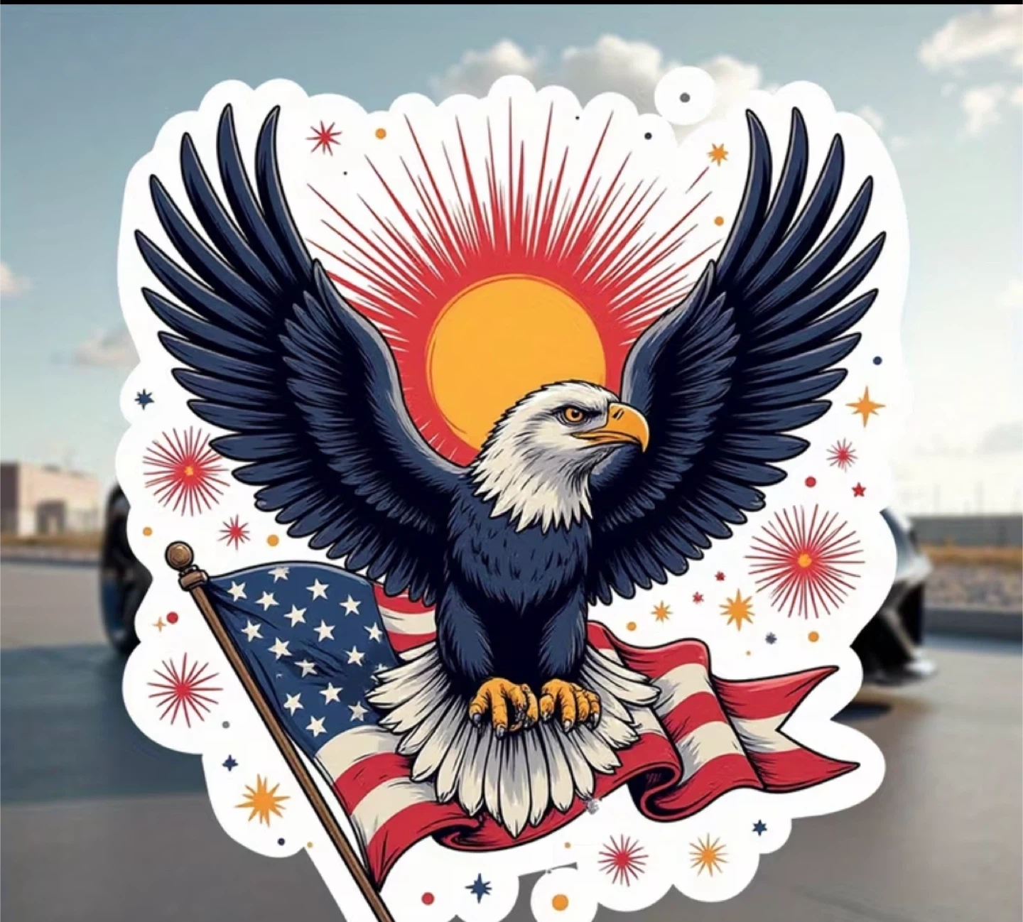 Cool sticker featuring a bald eagle with spread wings, an American flag, and a sunburst design. It's a great way to show your patriotic spirit! Perfect for decorating laptops, water bottles, or notebooks.