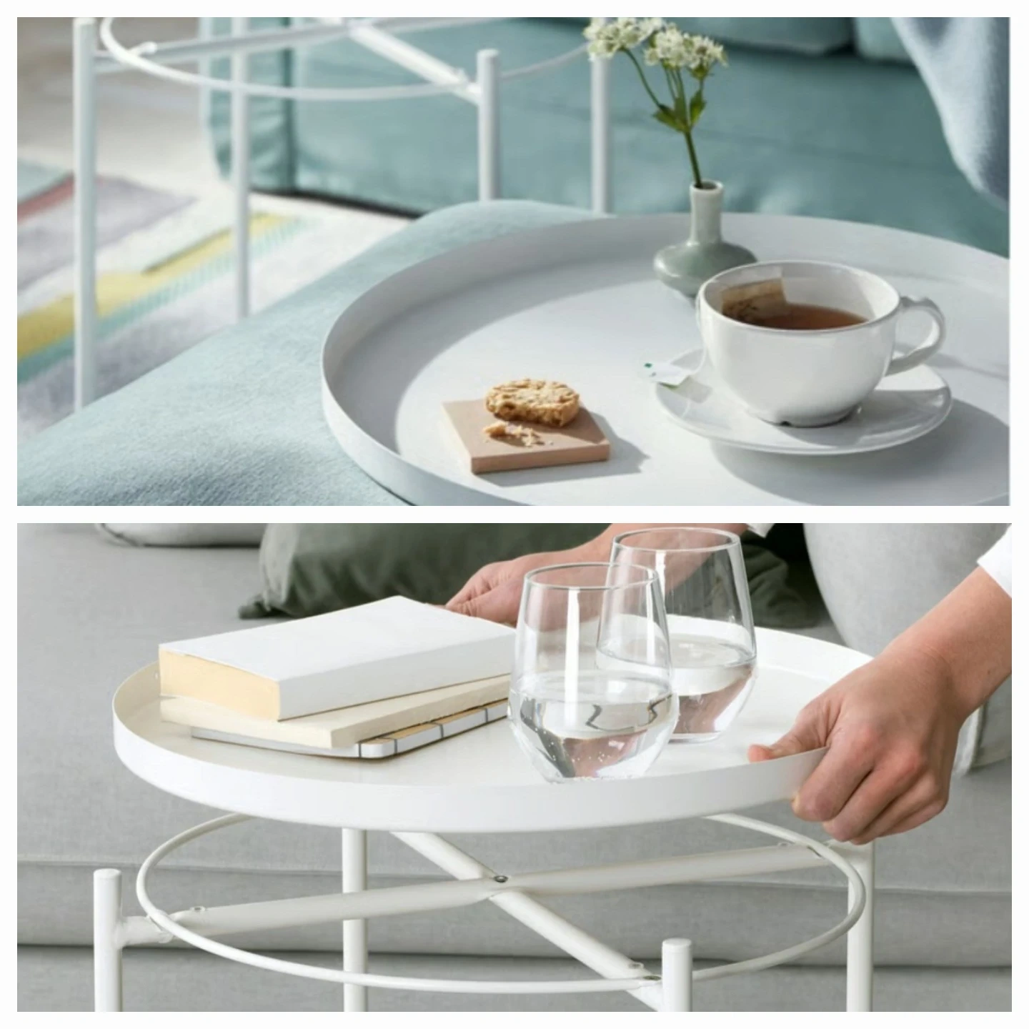 A handy side table with a removable tray top. It's perfect for placing drinks or snacks next to a sofa or chair. Measures 45 cm (17 1/2") in diameter and 53 cm (20 5/8") high.