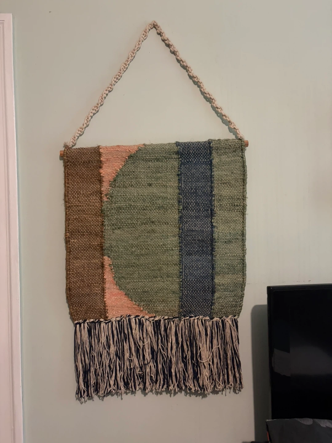 A woven textile piece featuring a geometric pattern in earthy tones and fringe detail. This unique wall art adds texture to any room.
