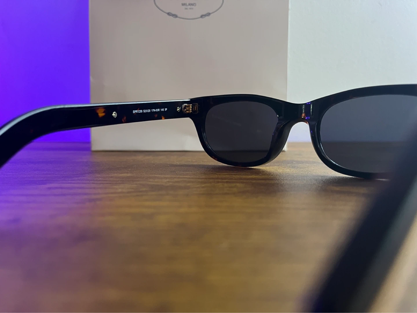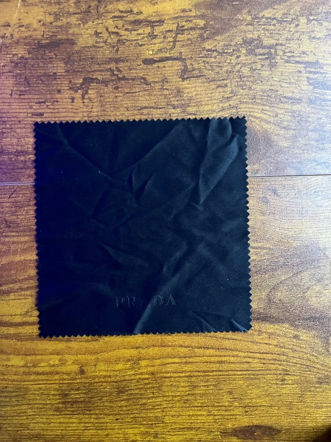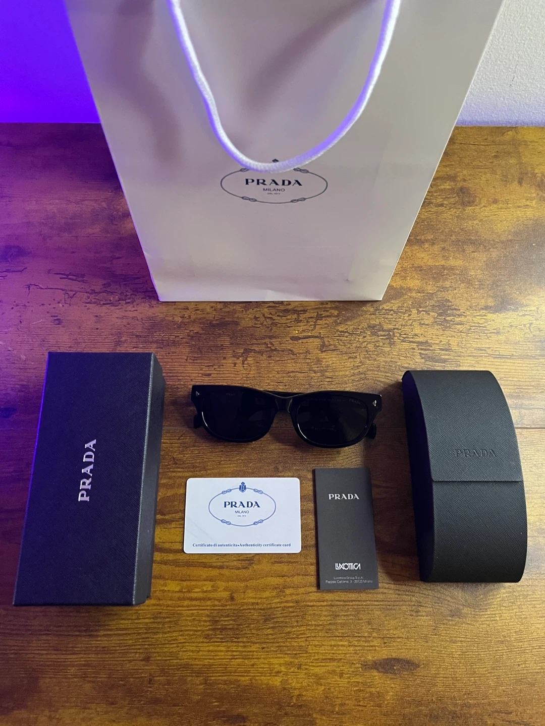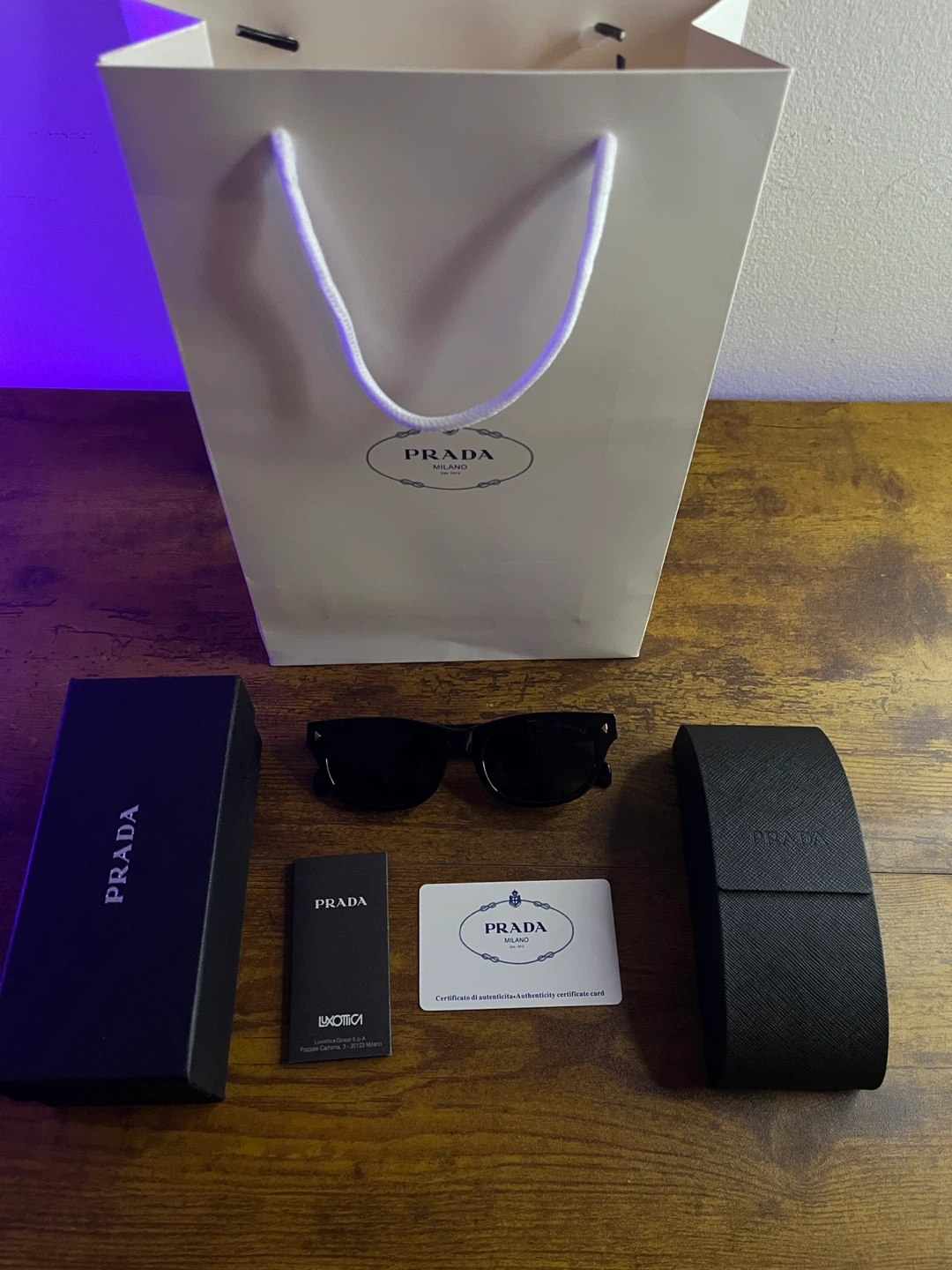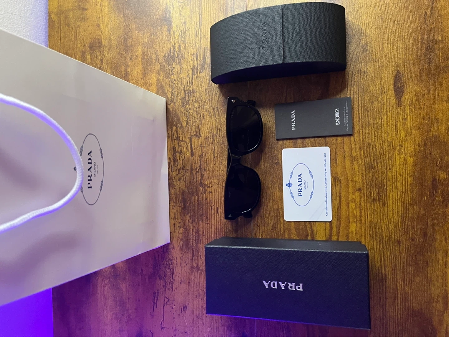 It comes with the original hard case, a soft cleaning pouch, an authenticity card, and the Prada shopping bag.