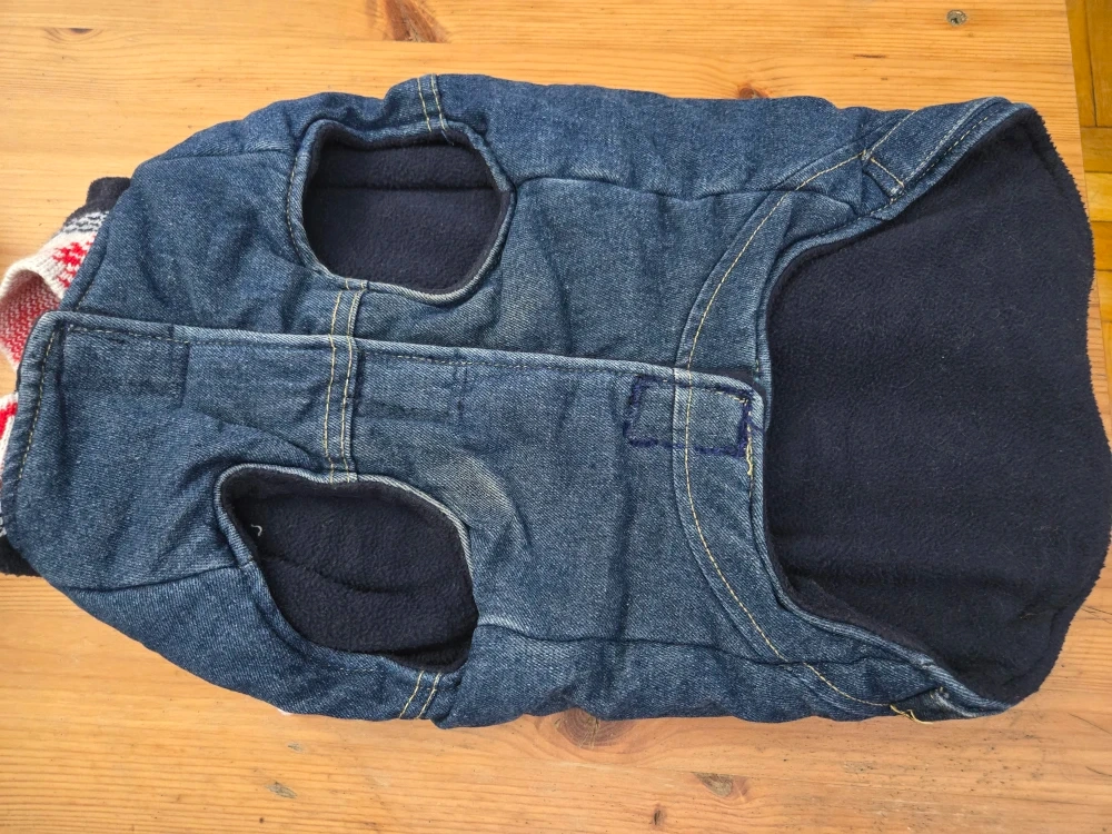 Very thick / warm denim dog coat with fleece lining! It's in great condition and ready for a new home. Also has a hood