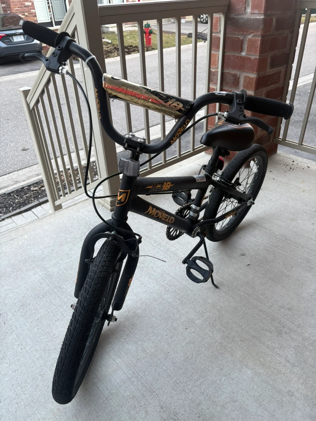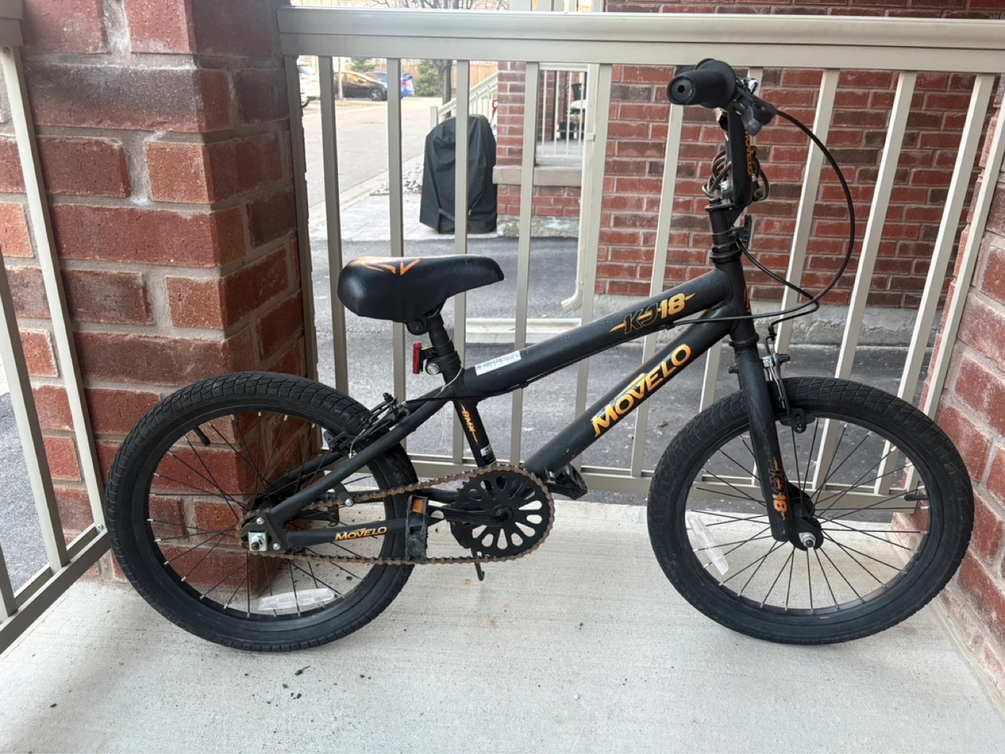 This is a black Movelo BMX bike with 18-inch wheels. It features a durable steel frame and sturdy pedals. Suitable for kids learning to ride or for backyard fun!