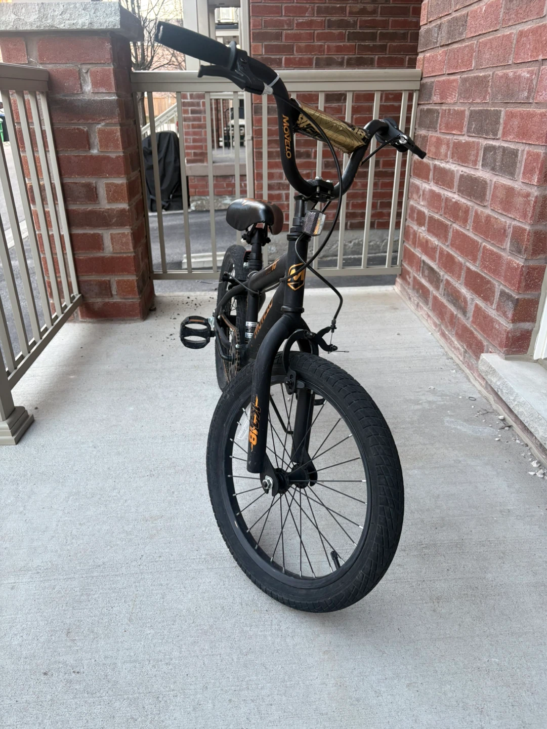 This is a black Movelo BMX bike with 18-inch wheels. It features a durable steel frame and sturdy pedals. Suitable for kids learning to ride or for backyard fun!