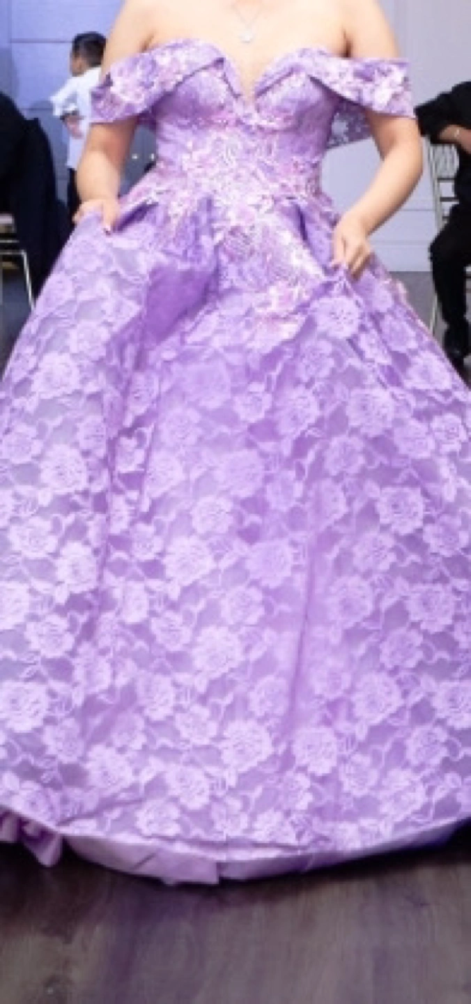 Beautiful purple ball gown with off-the-shoulder straps. Lace fabric with floral details. Perfect for a special occasion.
