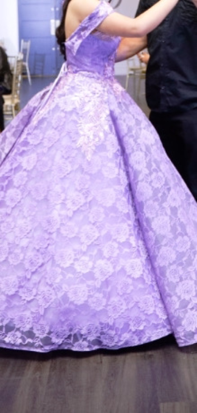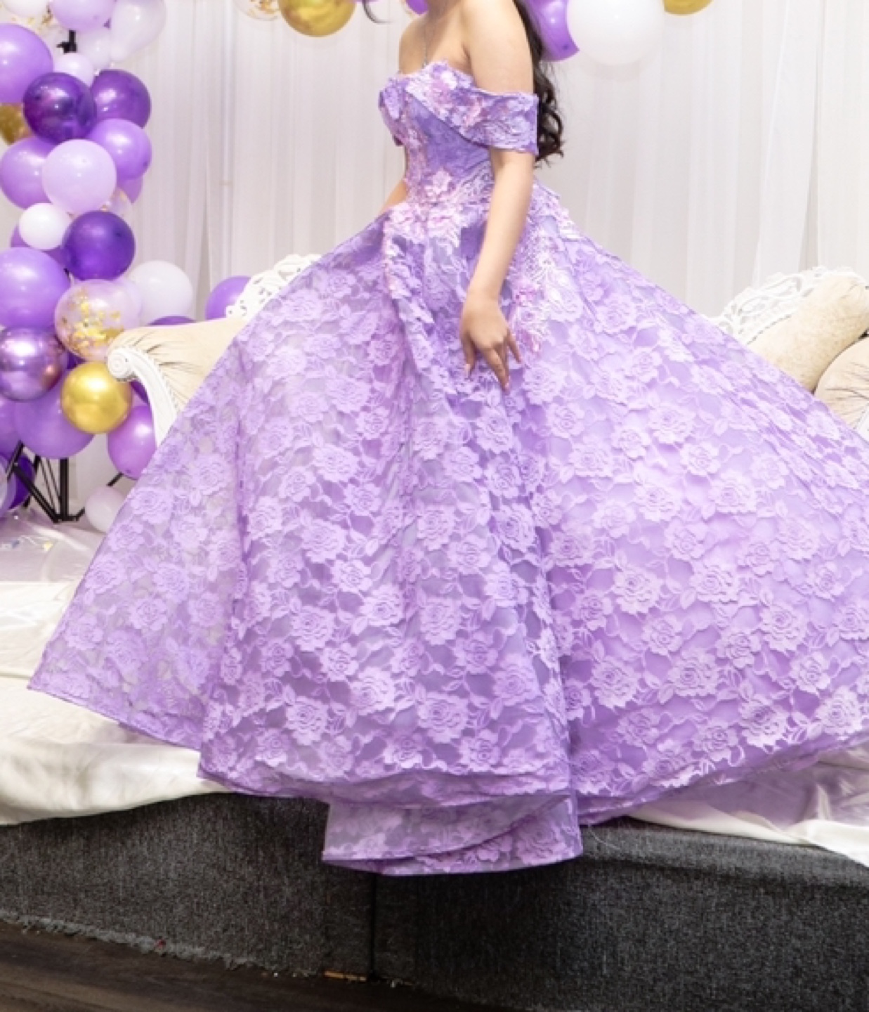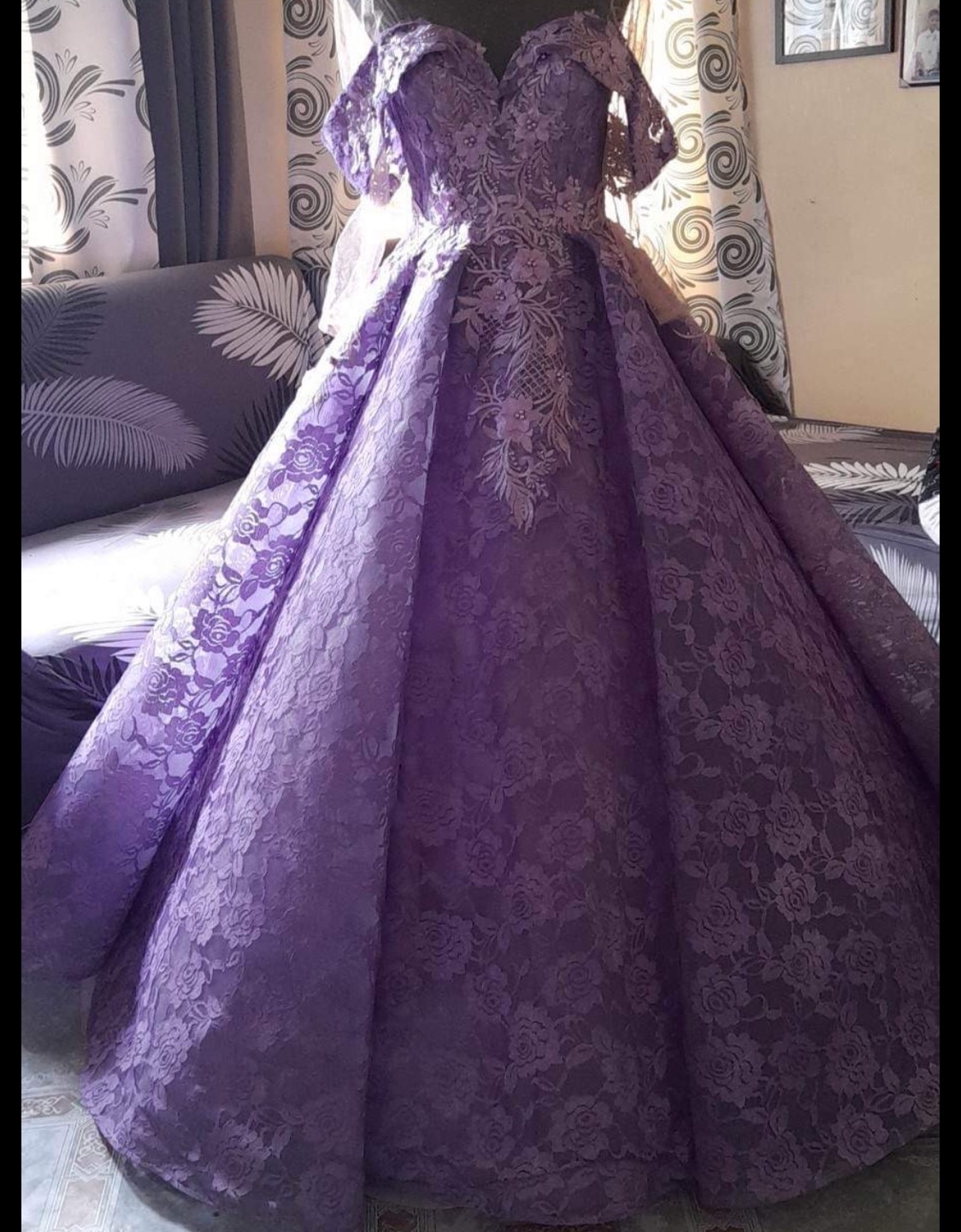 Beautiful purple ball gown with off-the-shoulder straps. Lace fabric with floral details. Perfect for a special occasion.