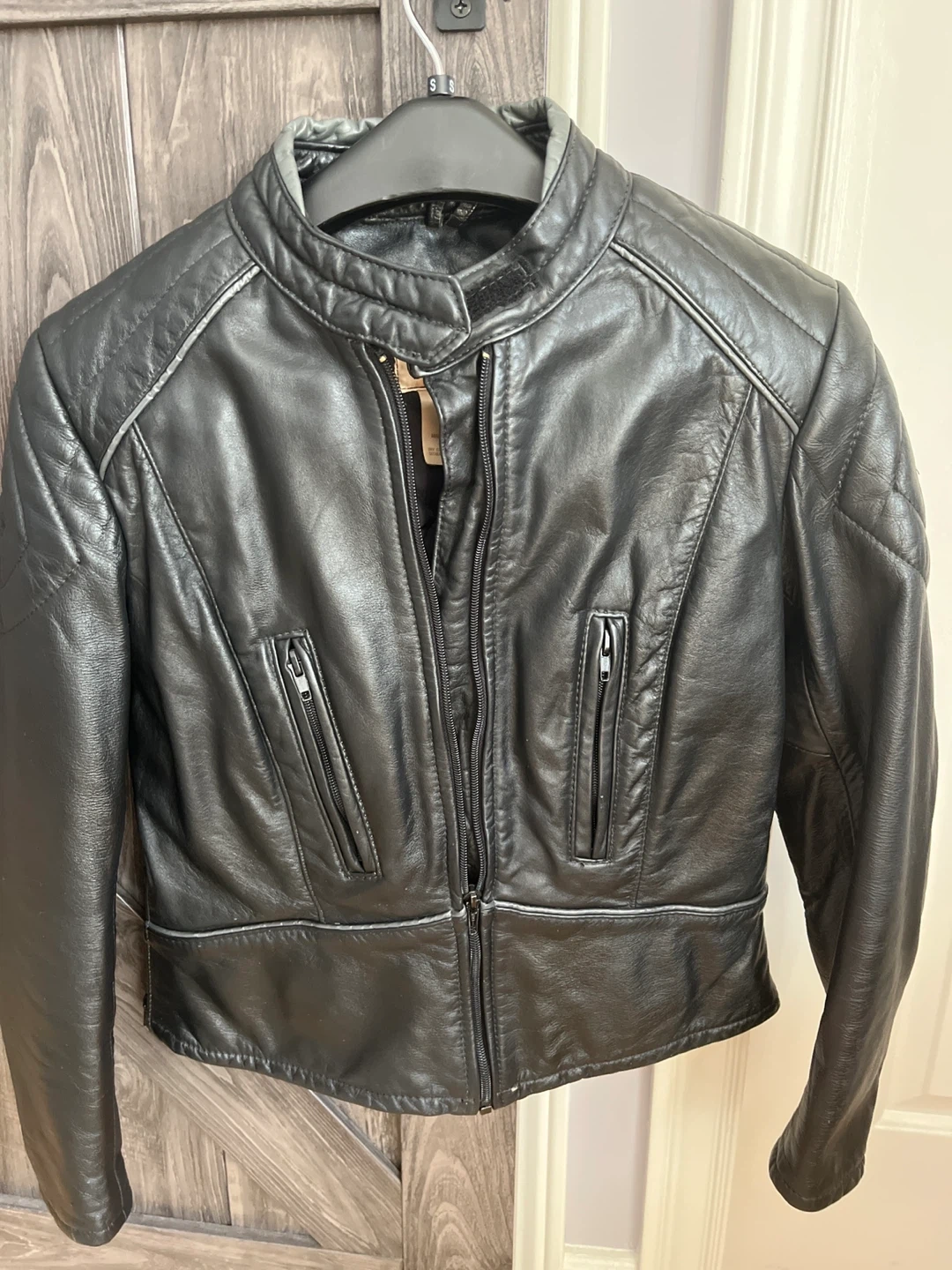 Classic black leather motorcycle jacket from Wolff of Canada. Made with 100% genuine leather. Features quilted detailing and multiple zippered pockets. This jacket is great for riding or as a stylish outerwear piece.