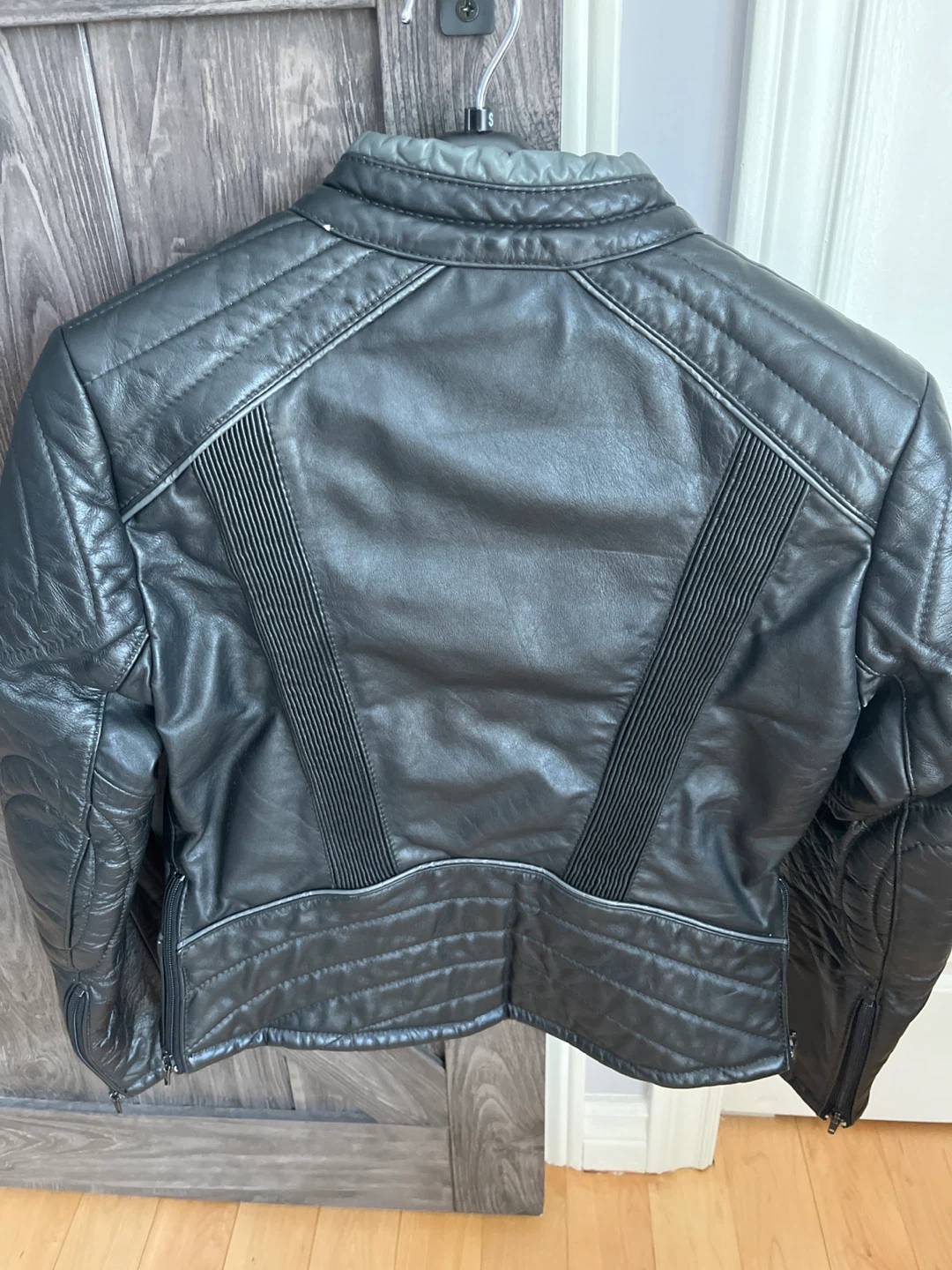 Classic black leather motorcycle jacket from Wolff of Canada. Made with 100% genuine leather. Features quilted detailing and multiple zippered pockets. This jacket is great for riding or as a stylish outerwear piece.