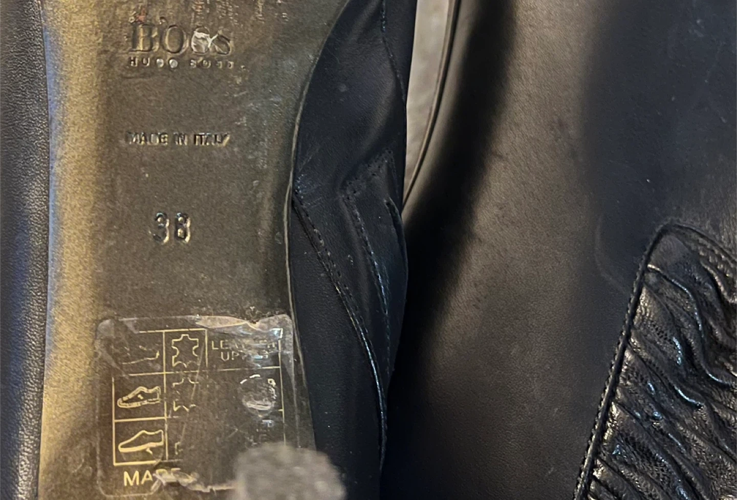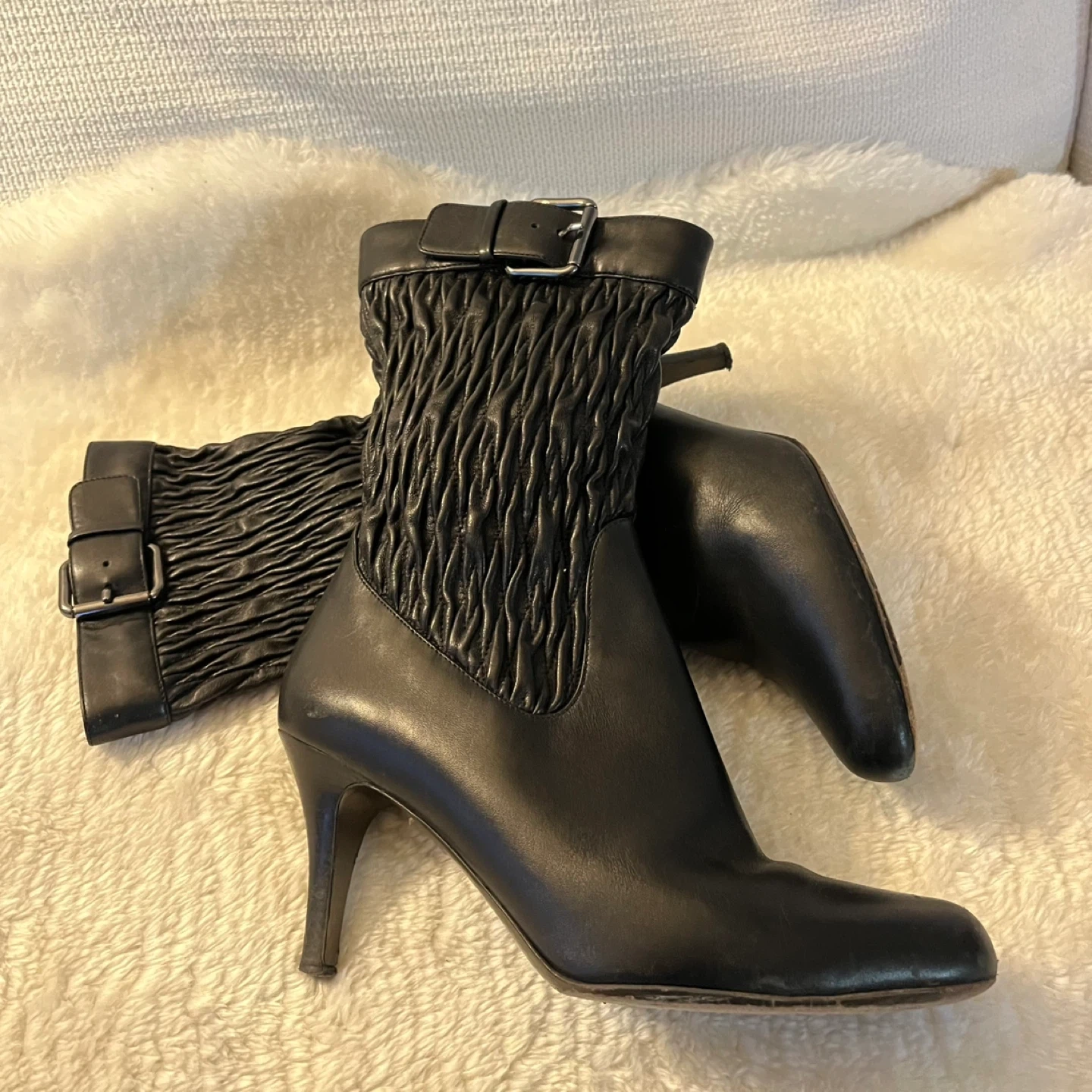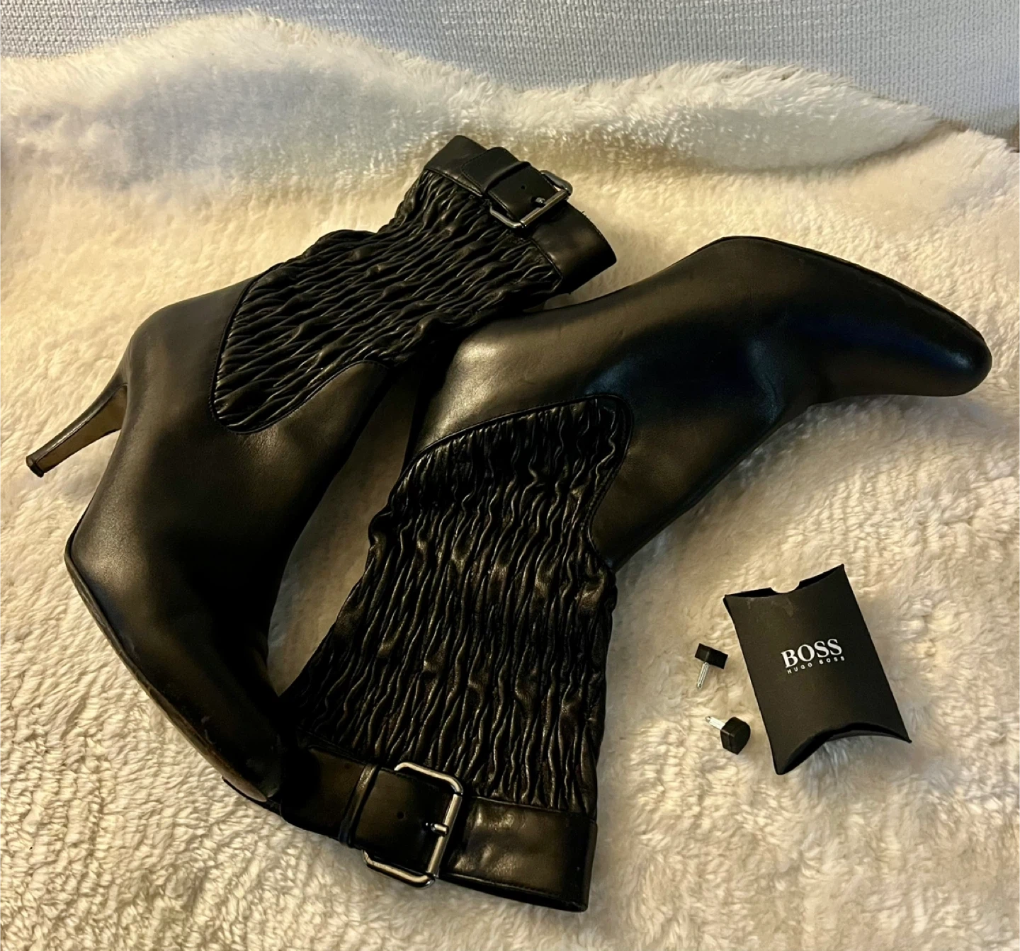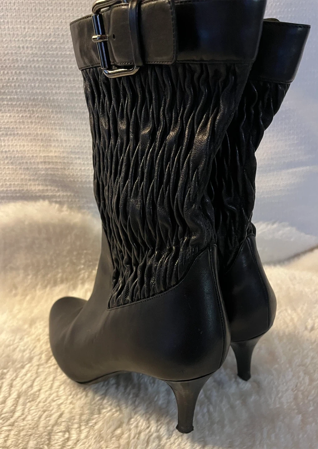 Hugo Boss Stylish black leather heel boots with an unique ruched design and a sleek buckle detail