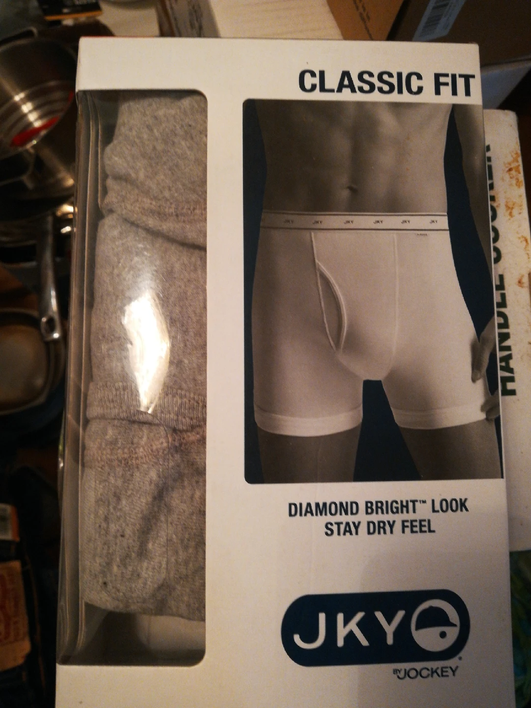 Selling a new pair of JKY by Jockey Classic Fit boxer briefs, size XL (40-42). These are made with Diamond Bright & White colors for a crisp look and advanced stay-dry fabric to help pull moisture away from your skin. They provide full coverage extending to the top of the thigh and are soft and durable 100% cotton, keeping their shape wash after wash