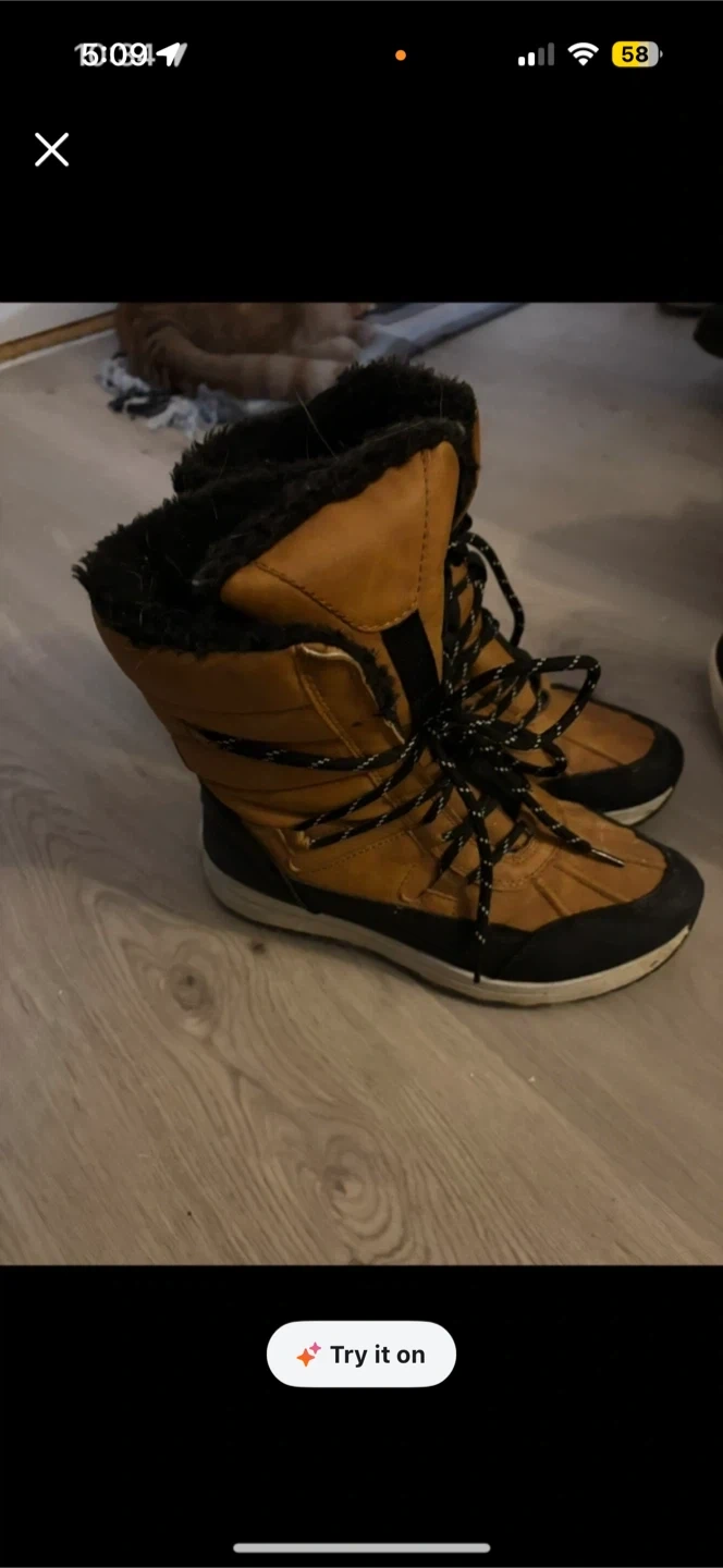 These tan winter boots feature a cozy black faux fur lining and durable black soles. They have black laces and a mix of materials on the exterior. These boots are perfect for keeping your feet warm during cold weather!