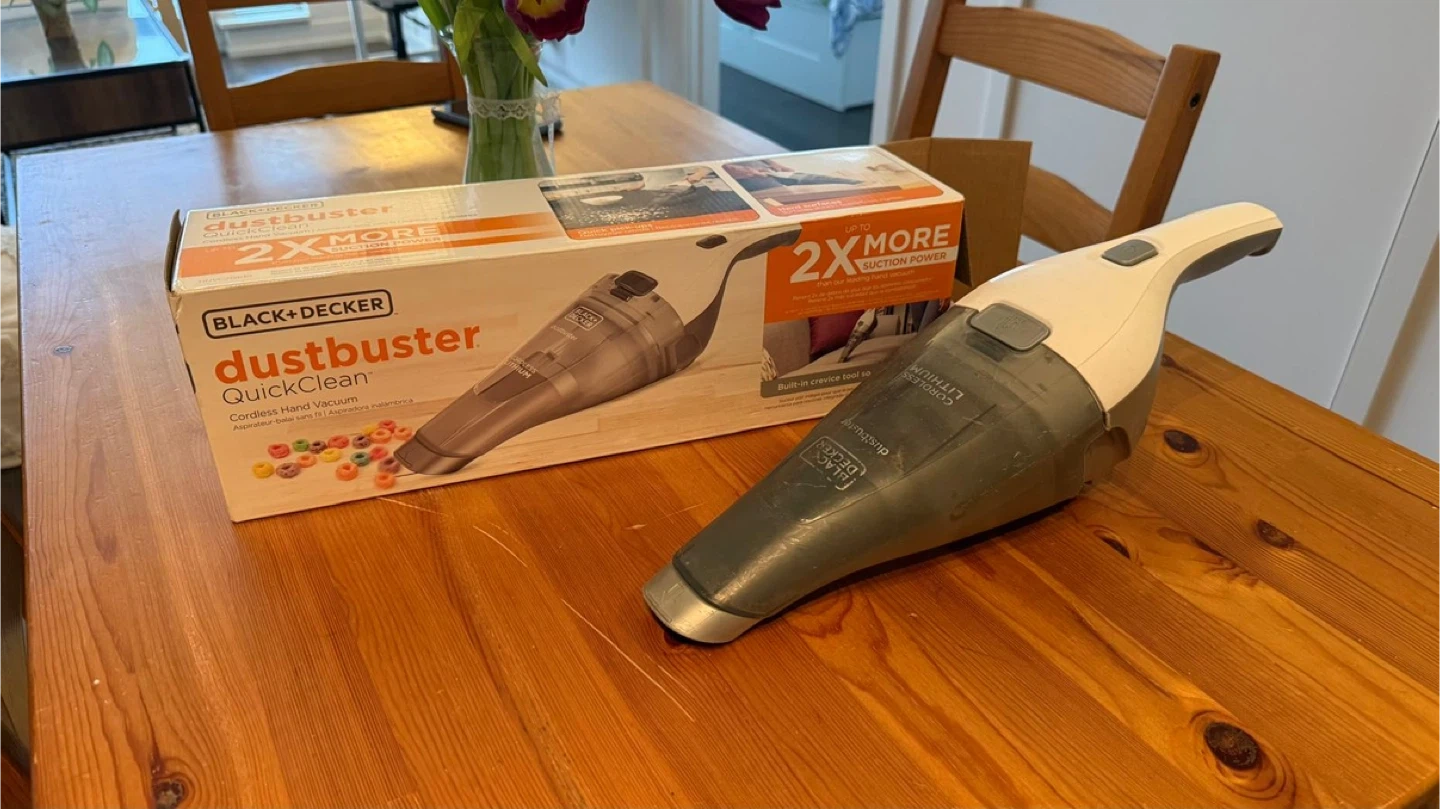 BLACK+DECKER Dustbuster QuickClean cordless hand vacuum. It's powered by lithium-ion technology for long-lasting charge. Built-in crevice tool for tight spaces!