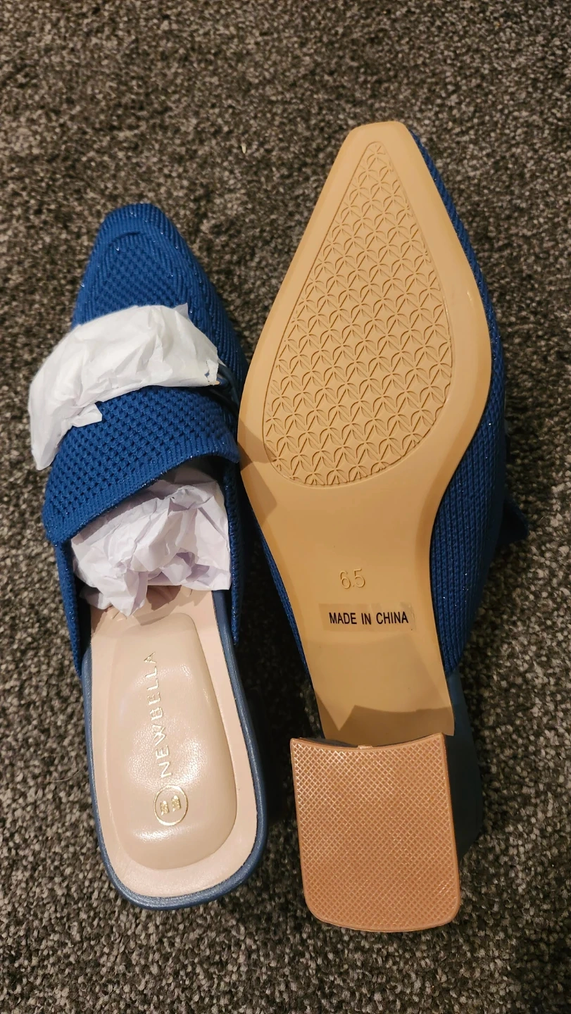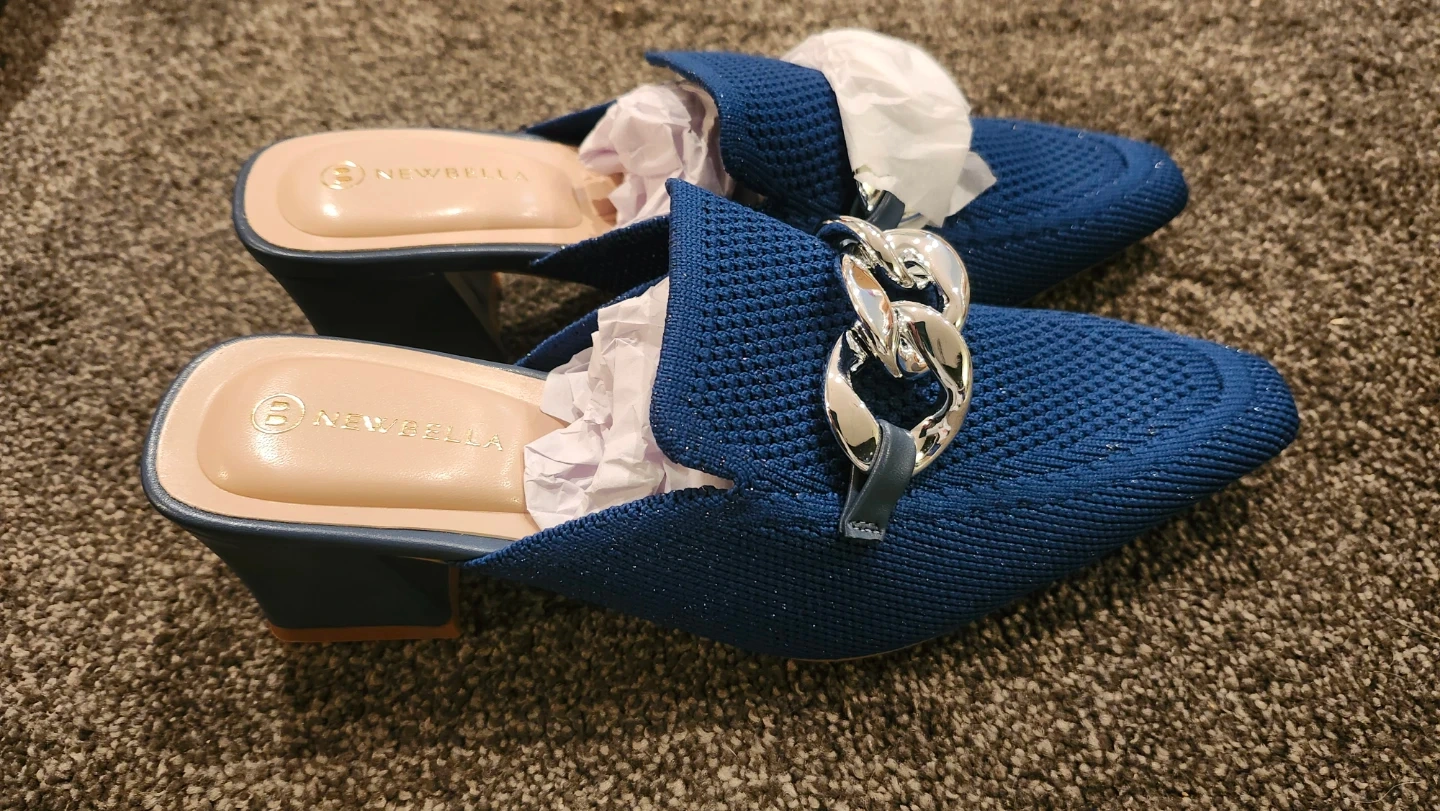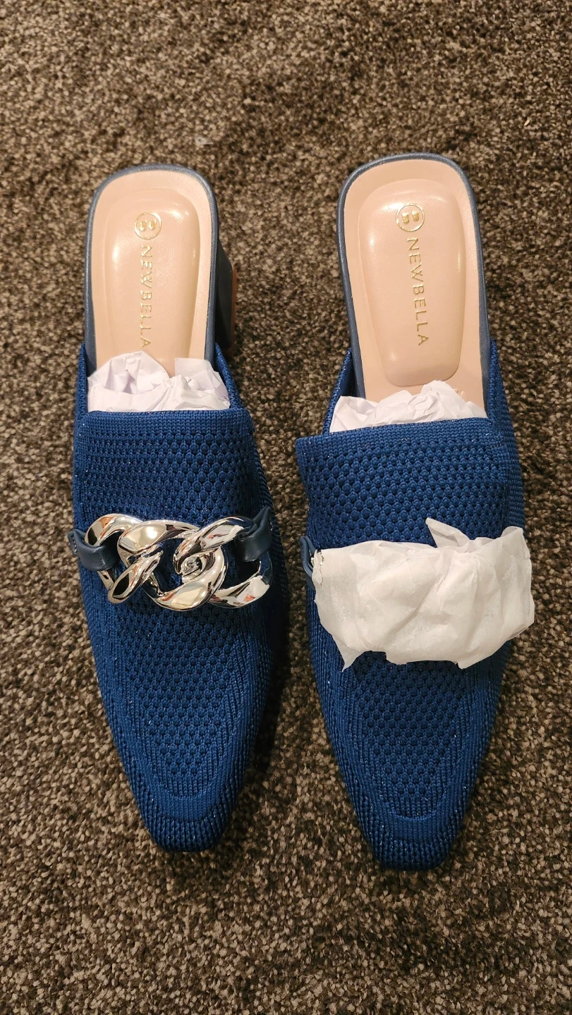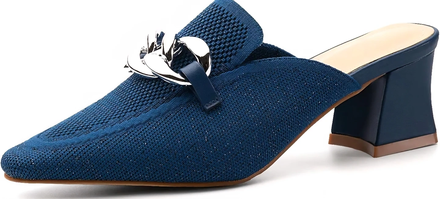 These stylish New Bella mules are a vibrant blue knit with a chic silver chain detail across the vamp. They feature a comfortable pointed toe and a chunky block heel. Easy slip-on style. Great for dressing up casual outfits!