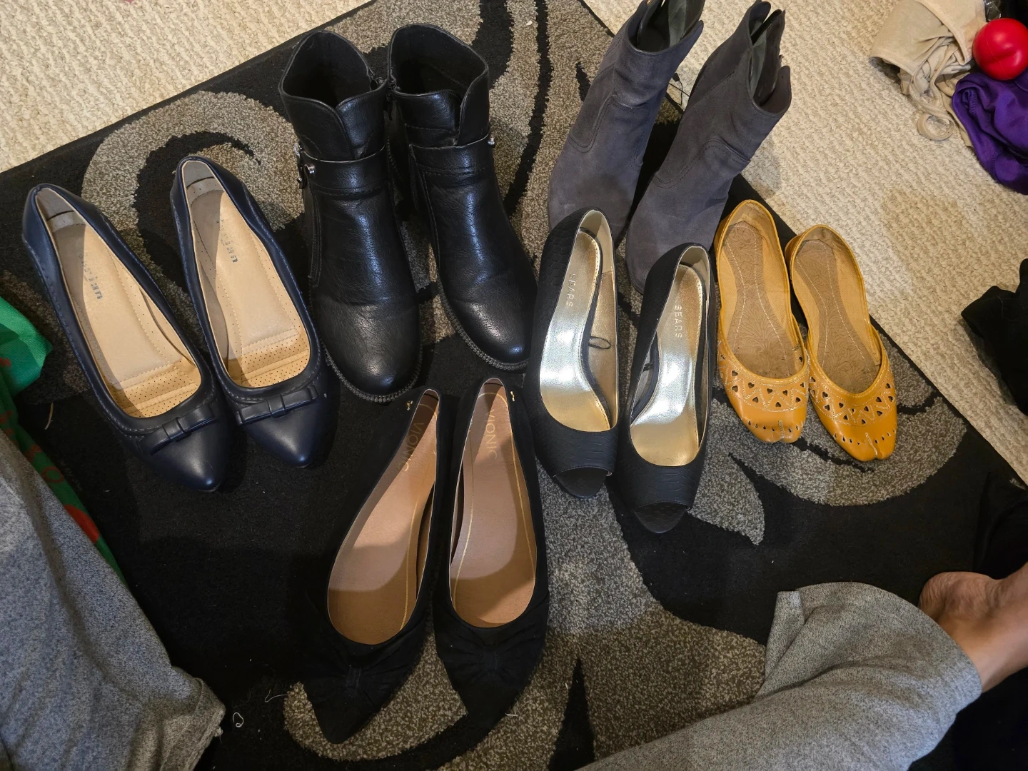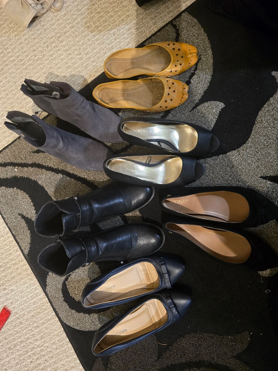 A collection of women's shoes including black ankle boots, grey ankle boots, black heels, tan flats, and yellow perforated flats. Some shoes may be leather or faux leather.