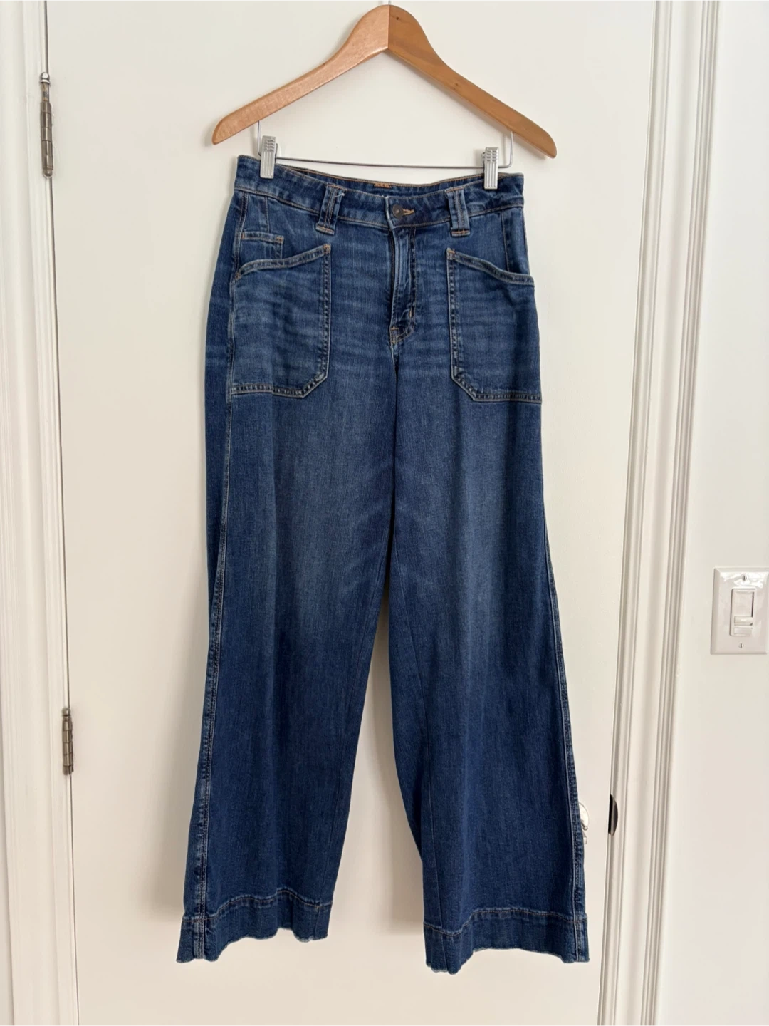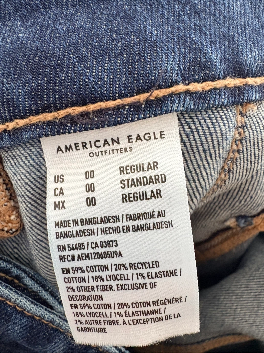 These American Eagle Outfitters jeans are a stylish wide-leg cut. They're made with a comfortable blend of 59% cotton, 20% recycled cotton, 18% lyocell, and 1% elastane. This provides stretch and a great feel for everyday wear.