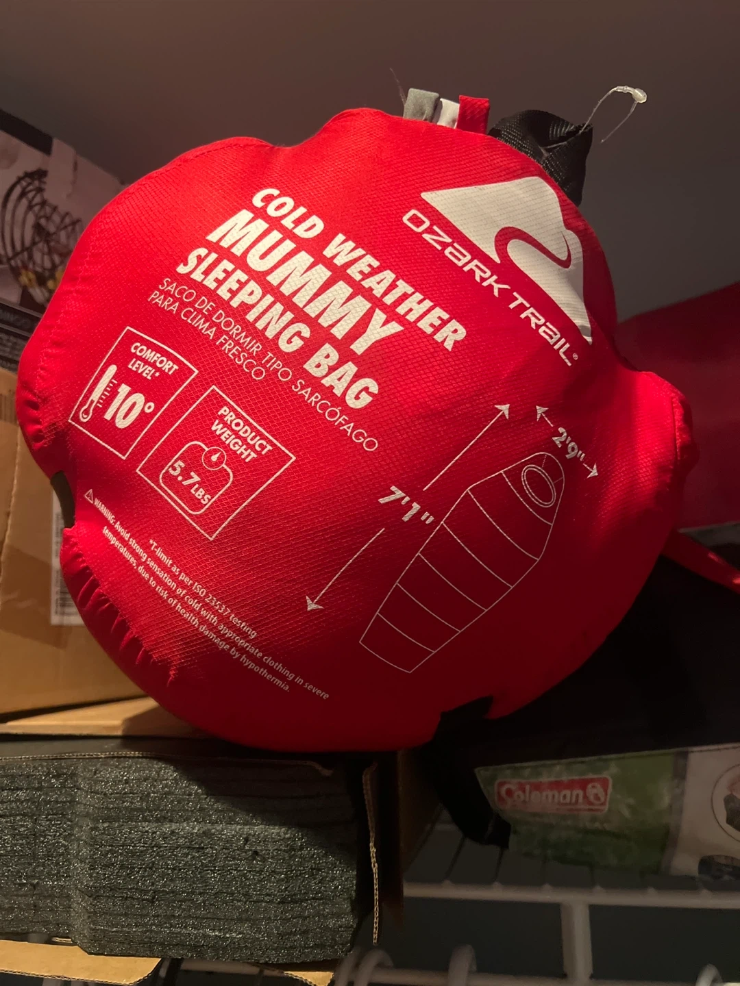 Selling an Ozark Trail cold weather mummy sleeping bag in red. It's designed for comfort down to 10 degrees. The bag is 7'1" long and 2'9" wide, and it weighs 5.7 lbs. Great for camping!