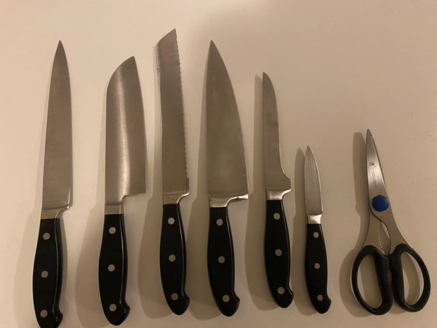 Moving sale!! 7-piece J.A. Henckels stainless steel knife set in block. Varying sizes, including bread knife, pairing knife, and scissors.
