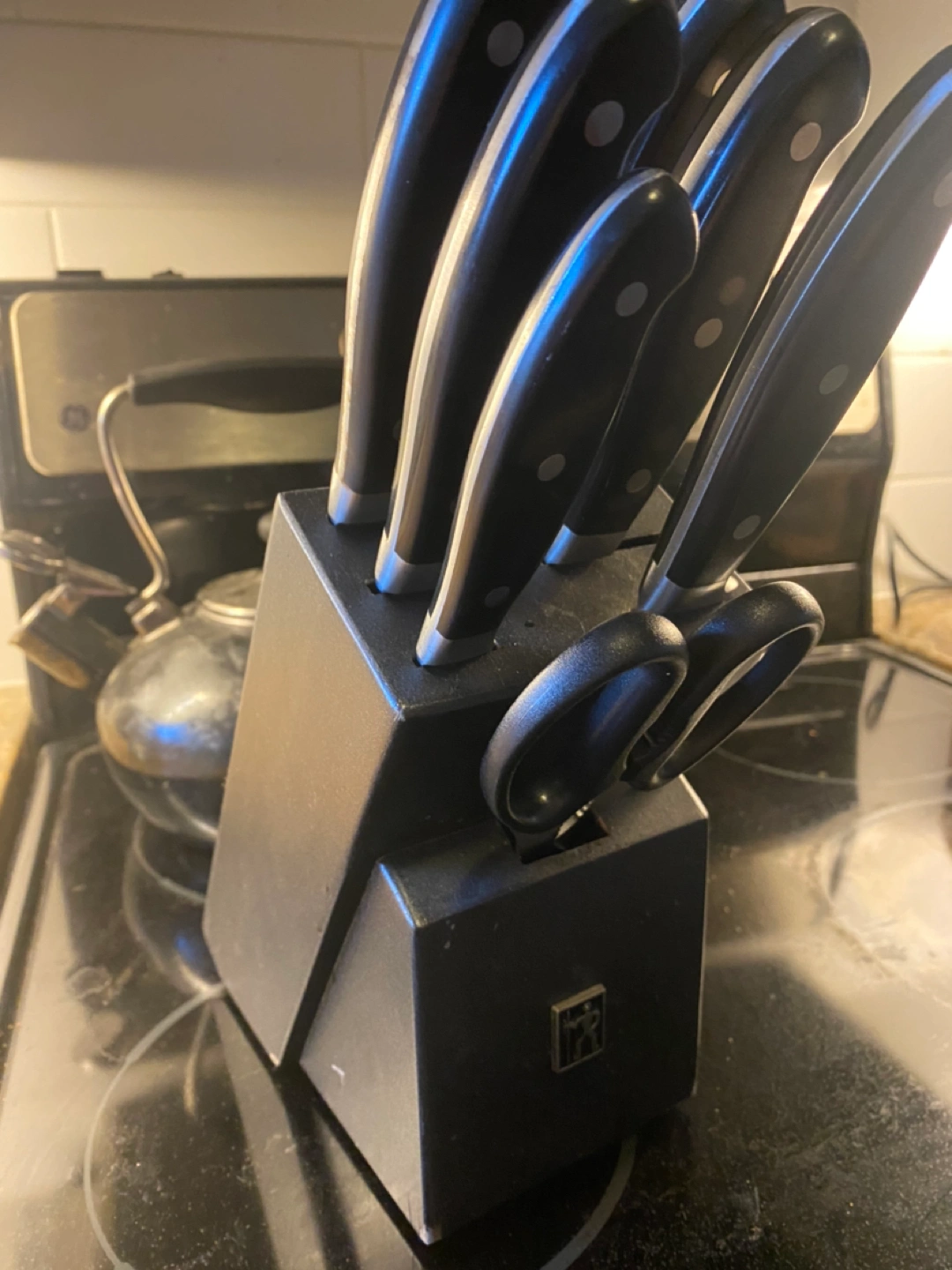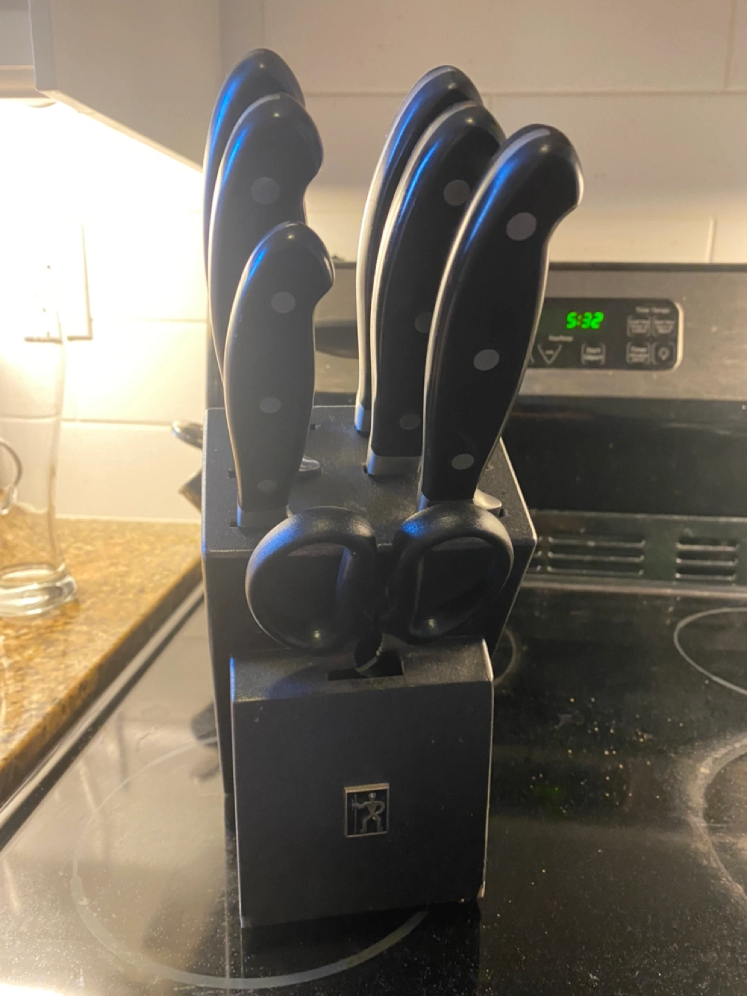 Moving sale!! 7-piece J.A. Henckels stainless steel knife set in block. Varying sizes, including bread knife, pairing knife, and scissors.