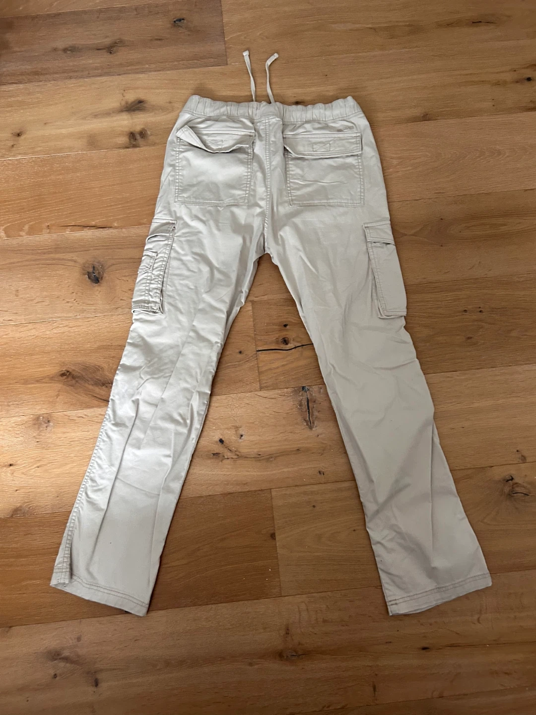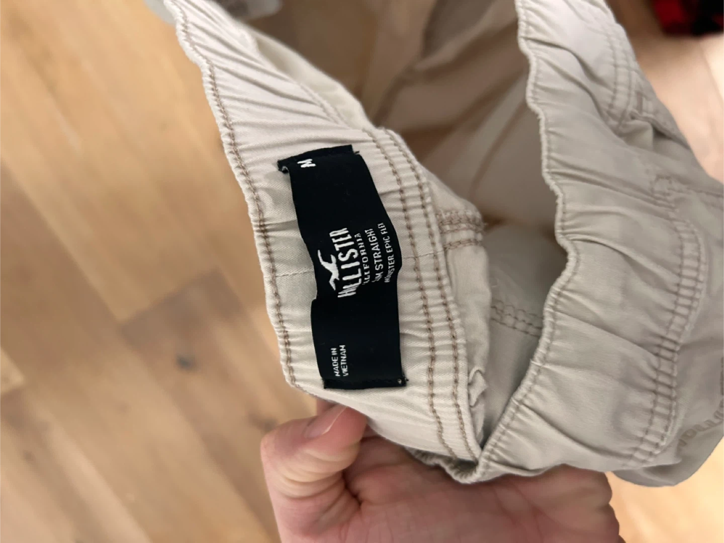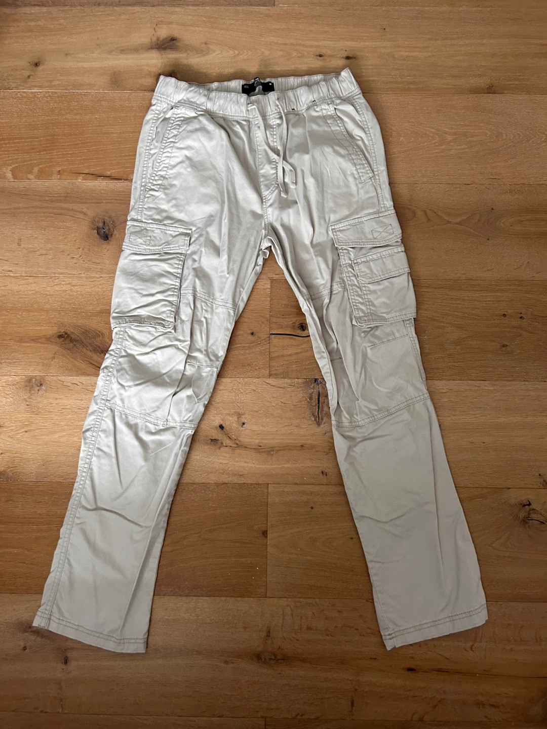 These are tan cargo pants from Hollister. They feature an elastic waistband with a drawstring. Size M.