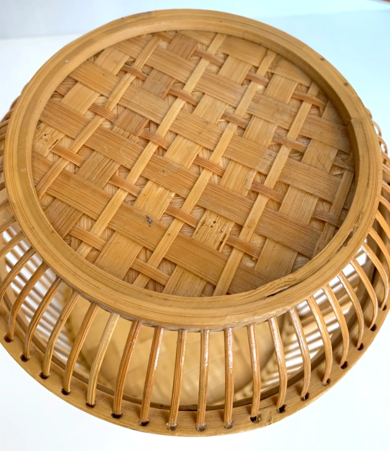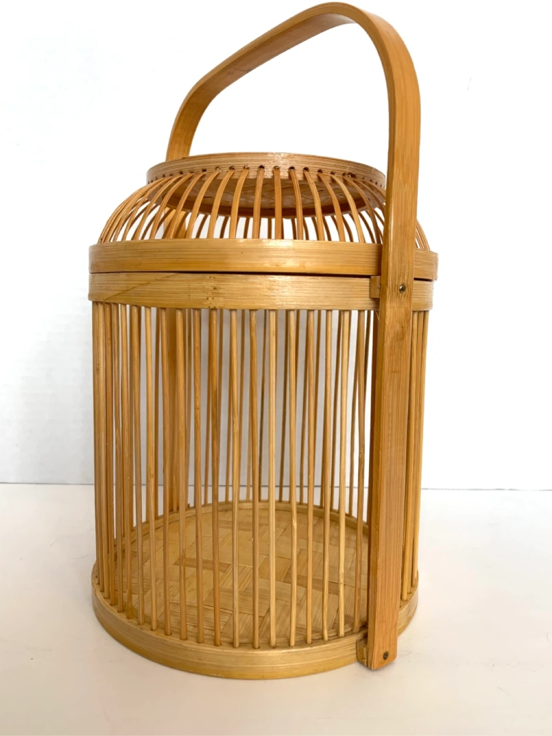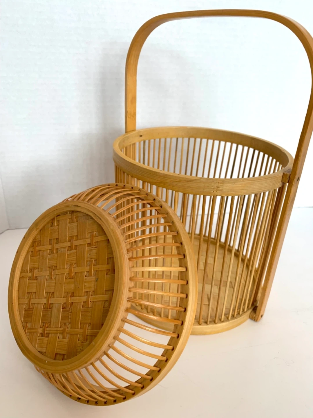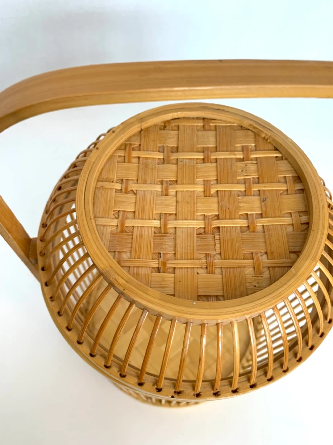 This is a lovely woven bamboo basket. It's perfect for storage or as a decorative piece. It features a sturdy handle for easy carrying.