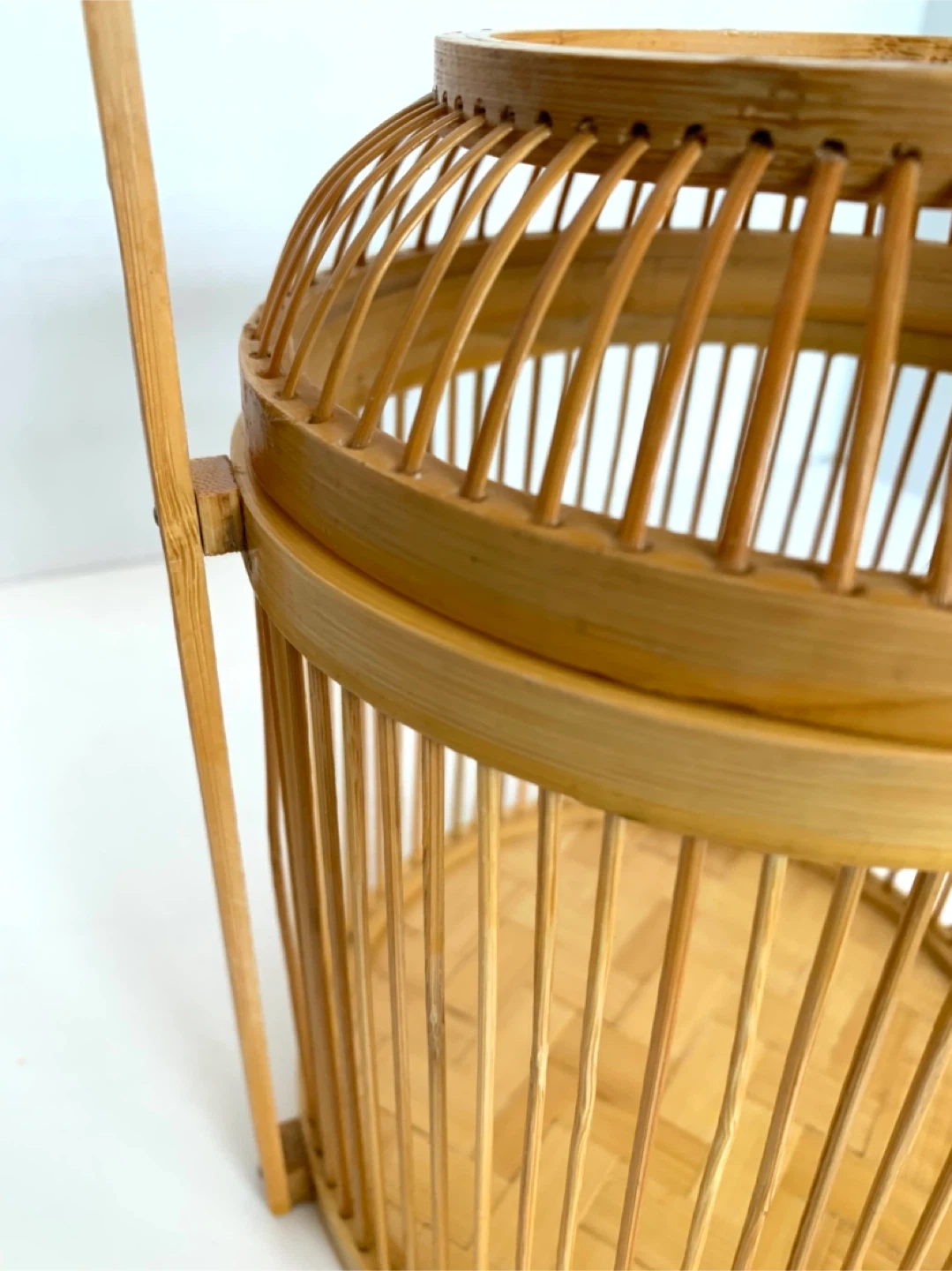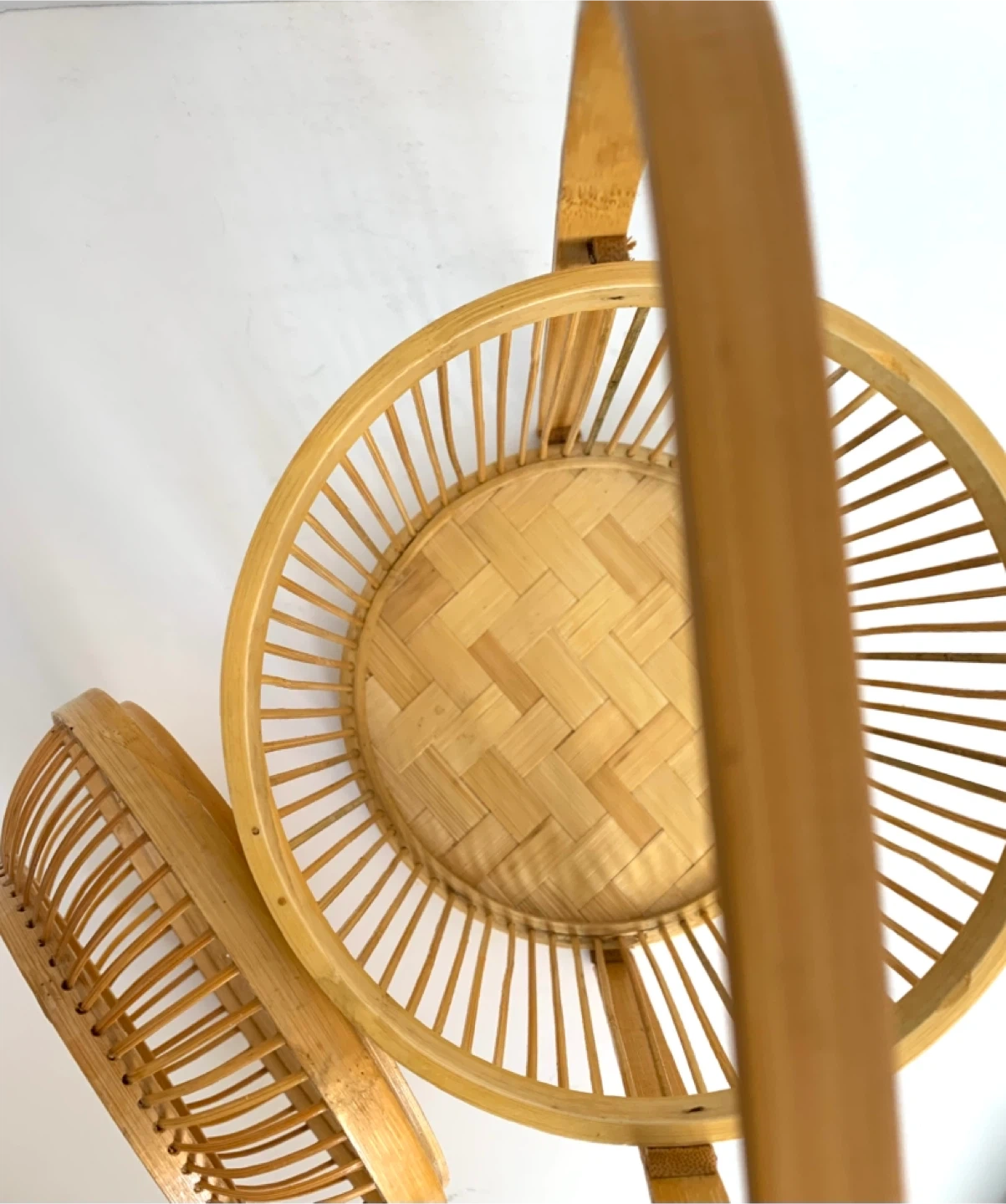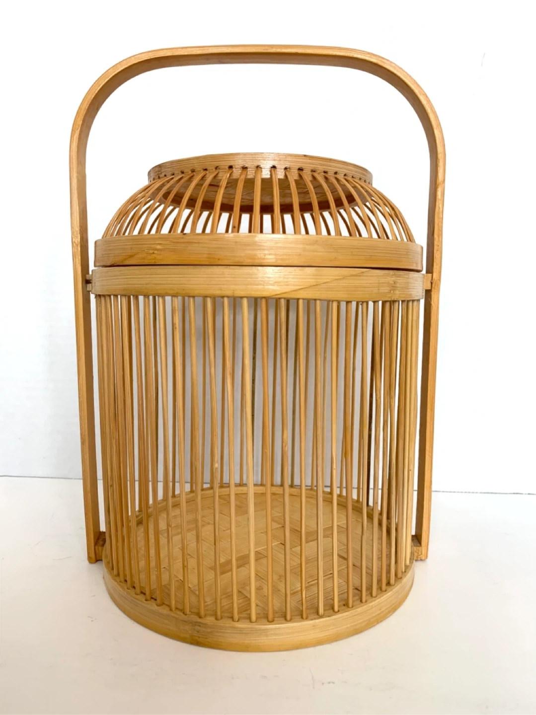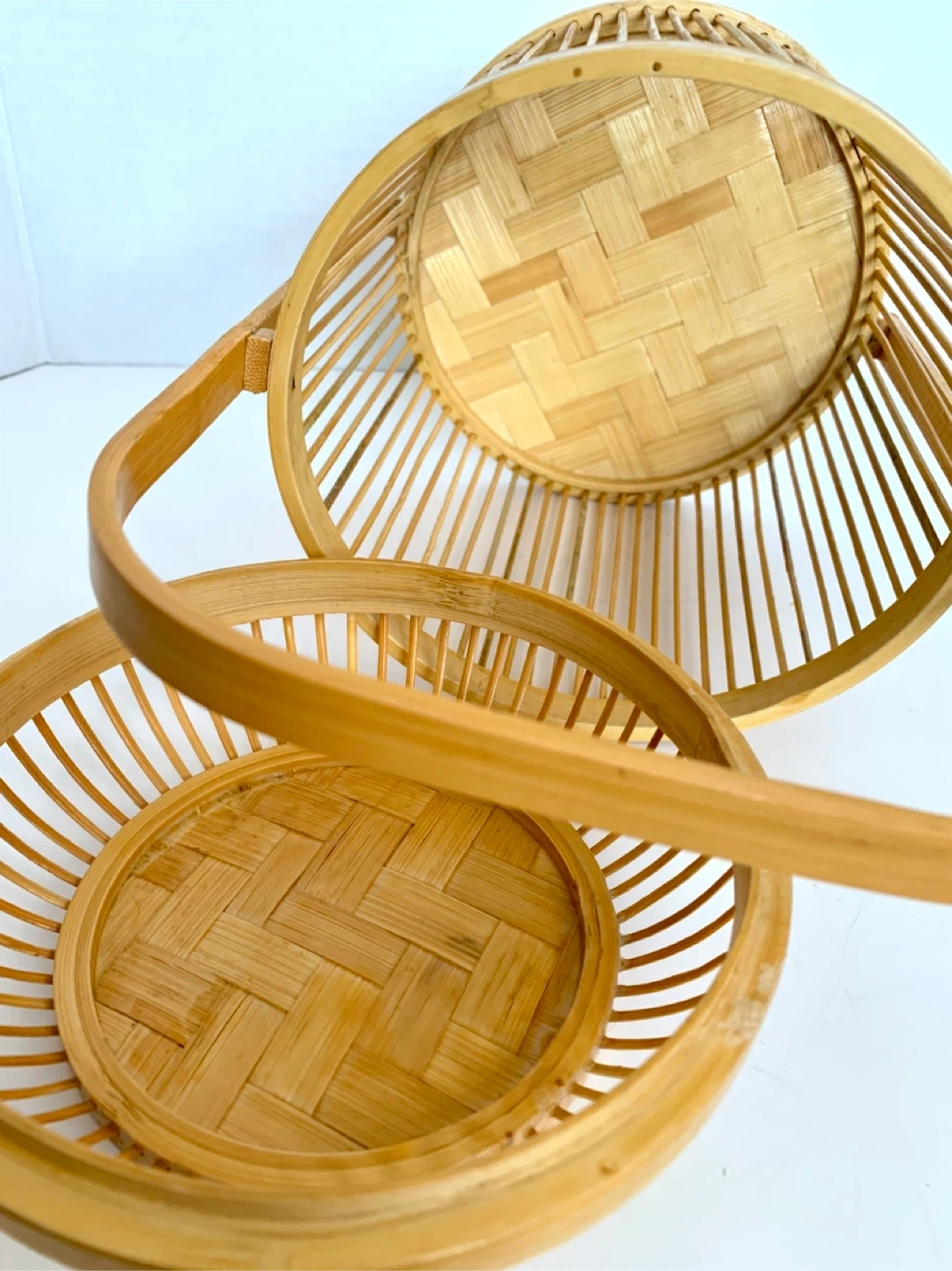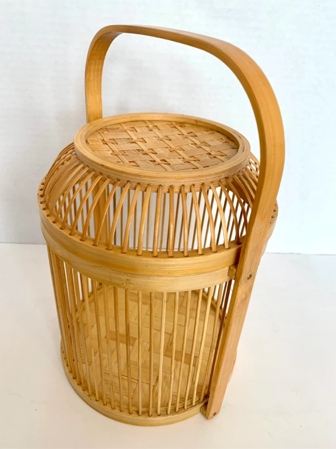 This is a lovely woven bamboo basket. It's perfect for storage or as a decorative piece. It features a sturdy handle for easy carrying.