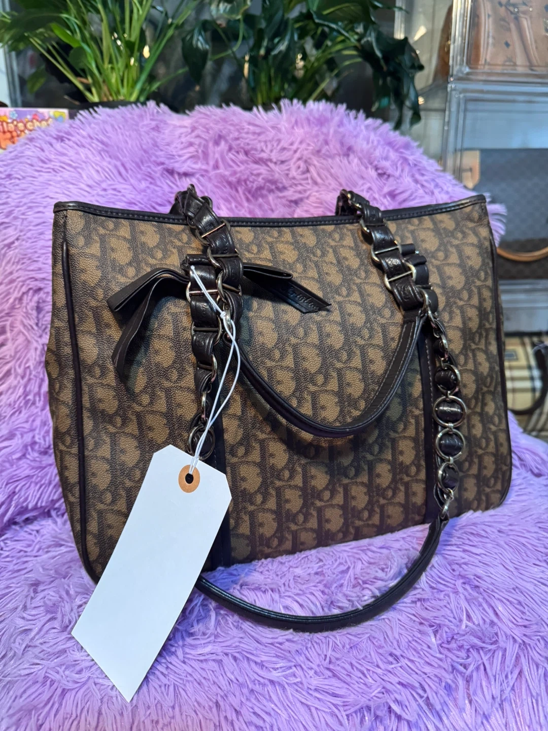 Selling a Dior tote bag featuring the iconic Trotter canvas pattern in brown and black. It has black leather trim and silver-tone hardware. Perfect for everyday use!