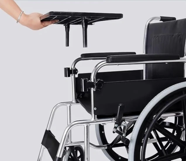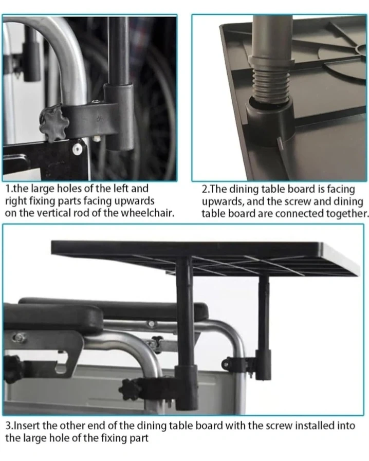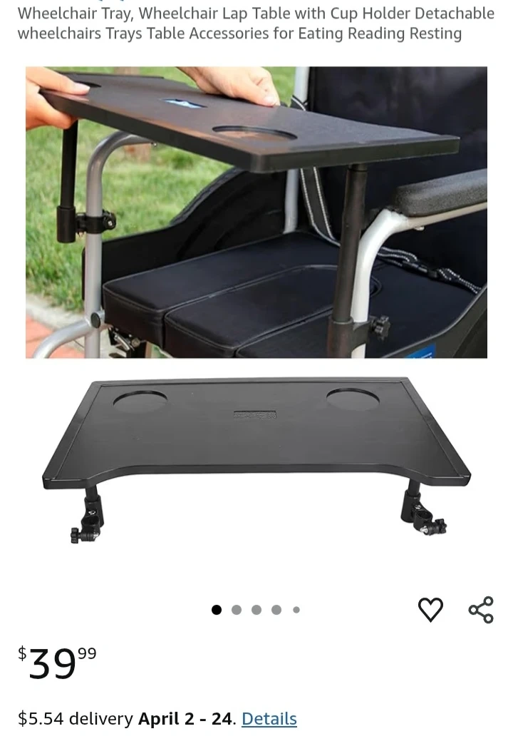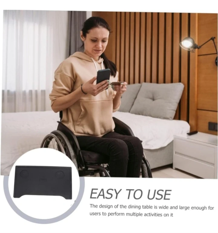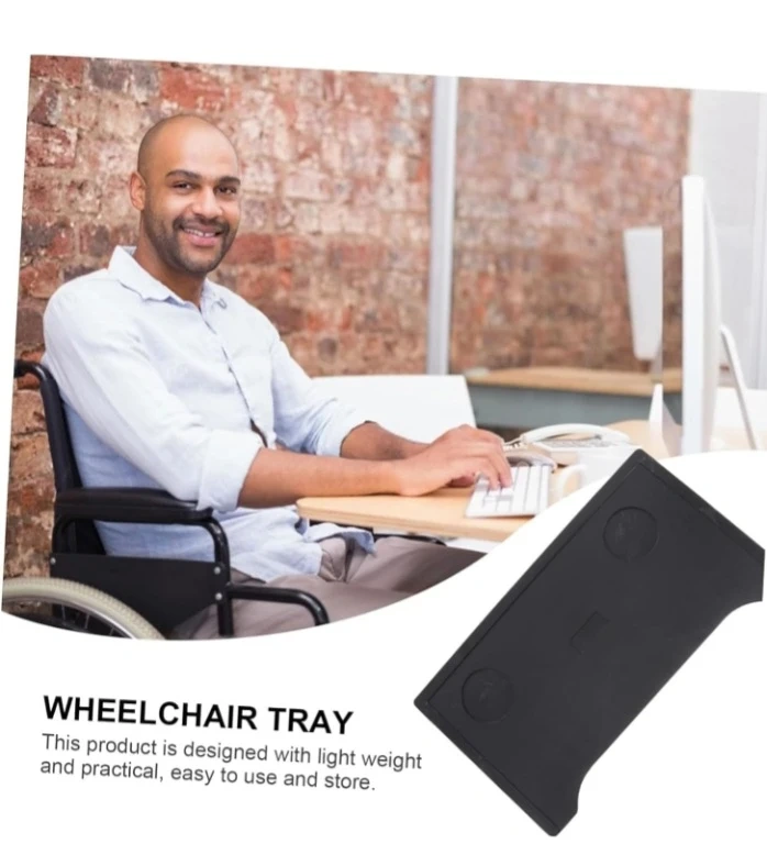 This wheelchair tray attaches easily to your chair. It's designed with a wide surface and cup holders. The black tray is lightweight and practical for eating or resting items.