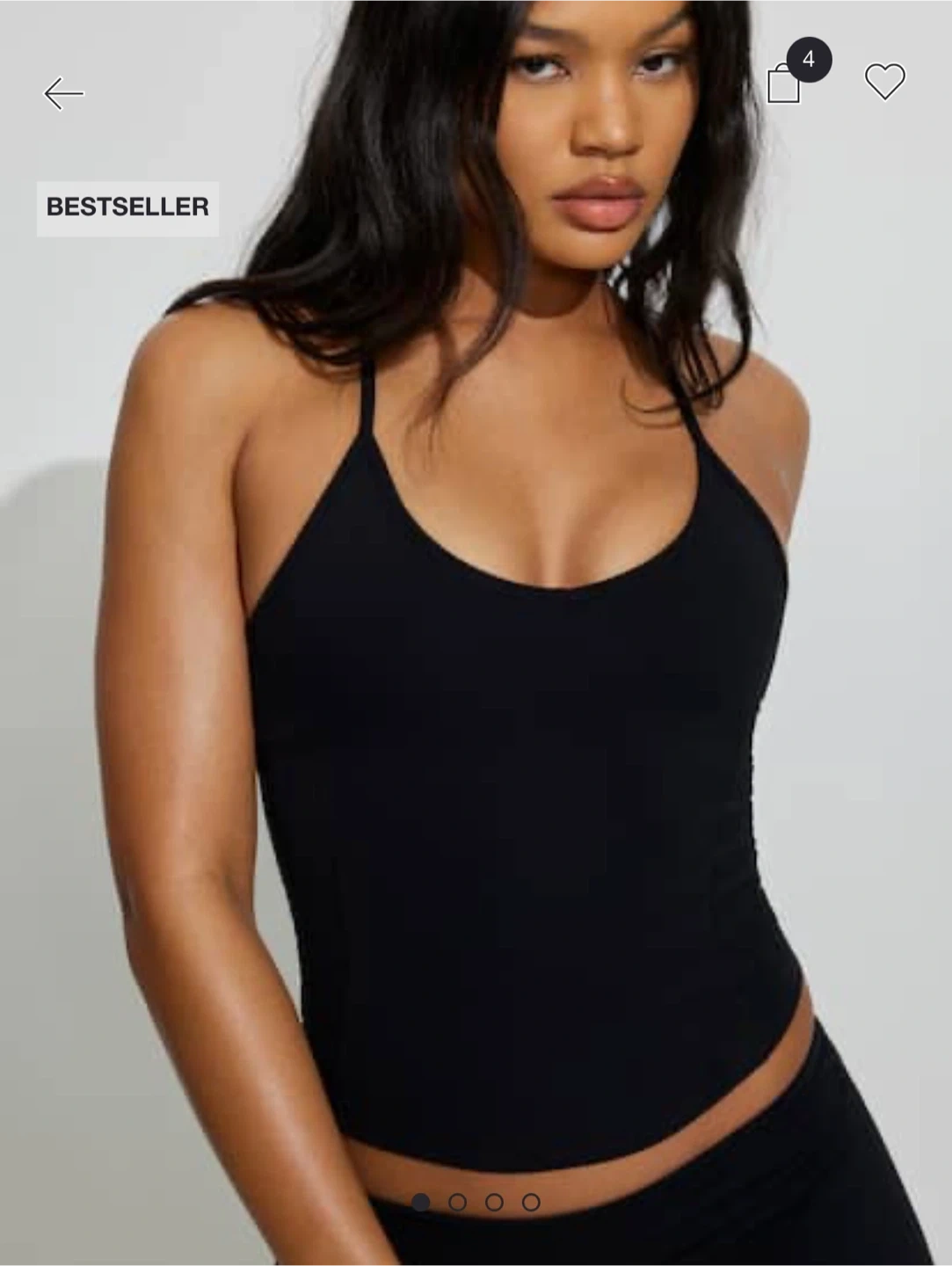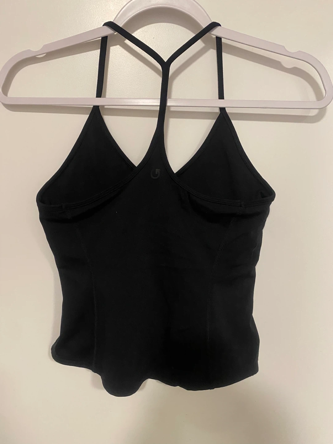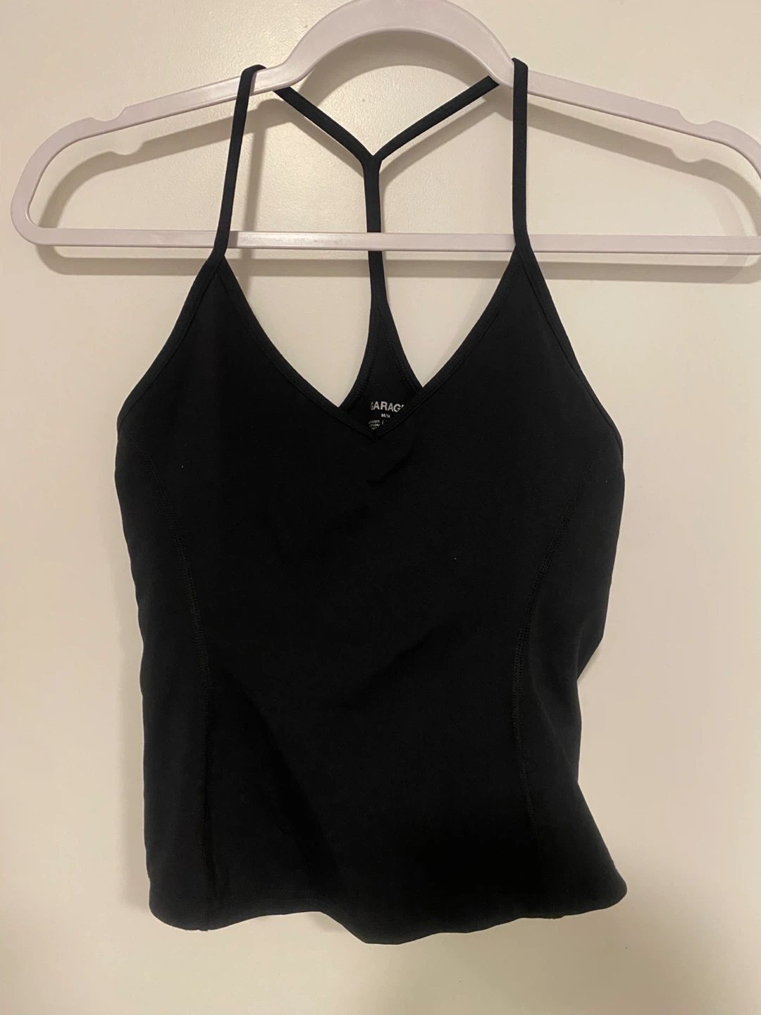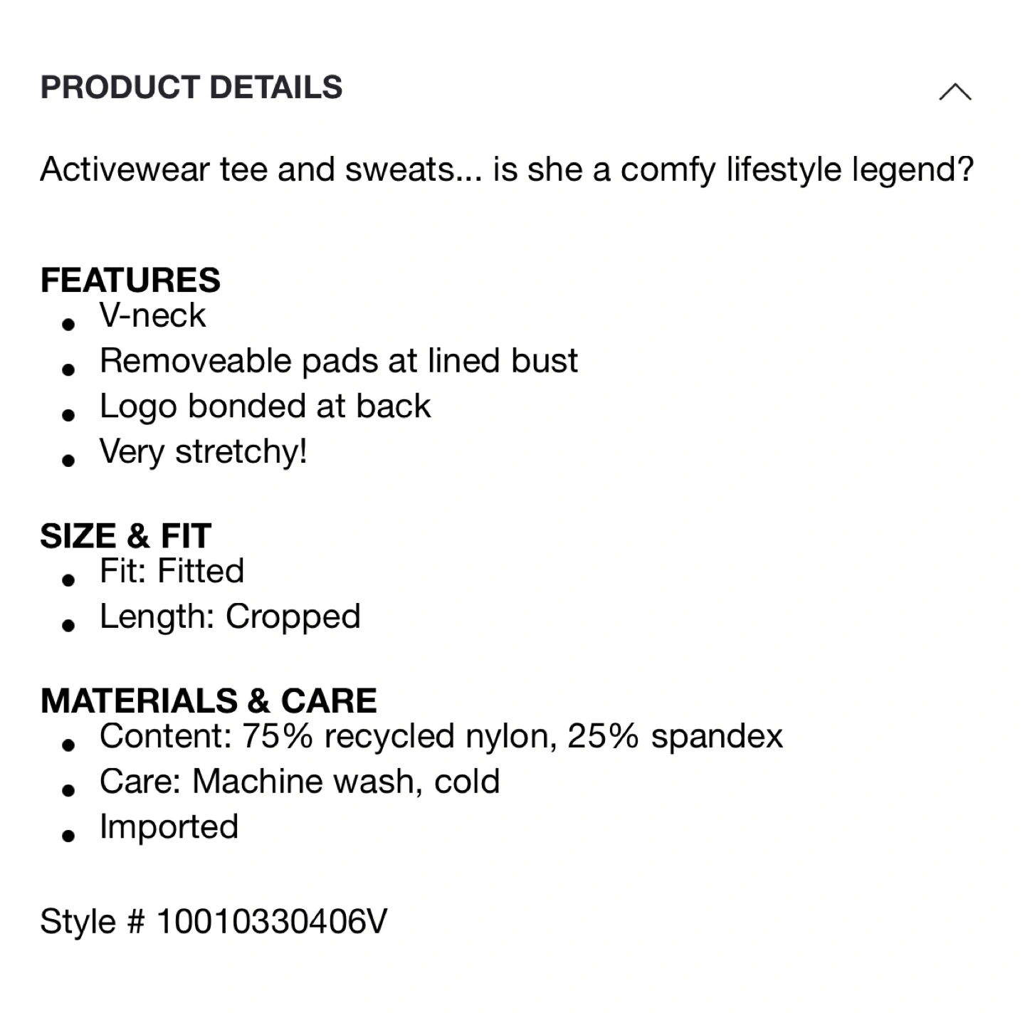 This is a black tank top with a V-neck. It's made of 75% recycled nylon and 25% spandex. It's cropped and has a fitted style.