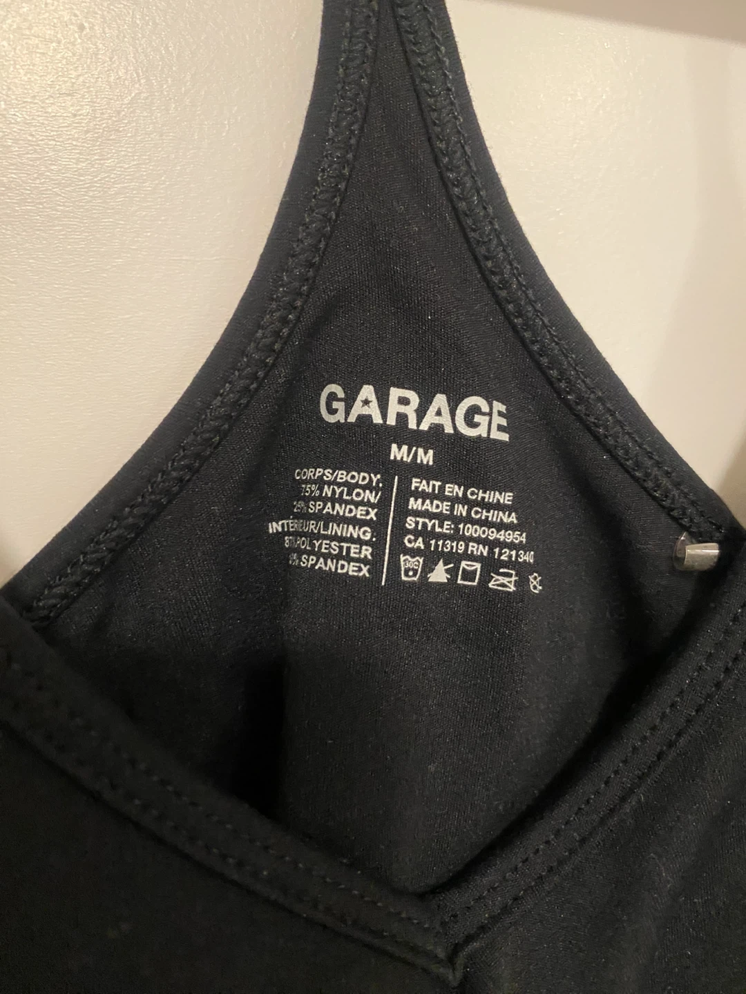 This is a black tank top with a V-neck. It's made of 75% recycled nylon and 25% spandex. It's cropped and has a fitted style.