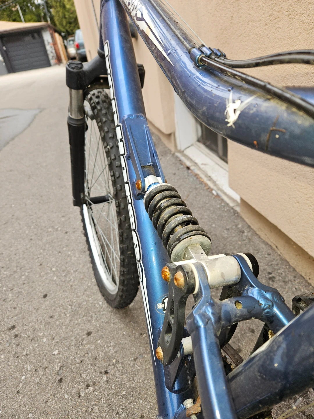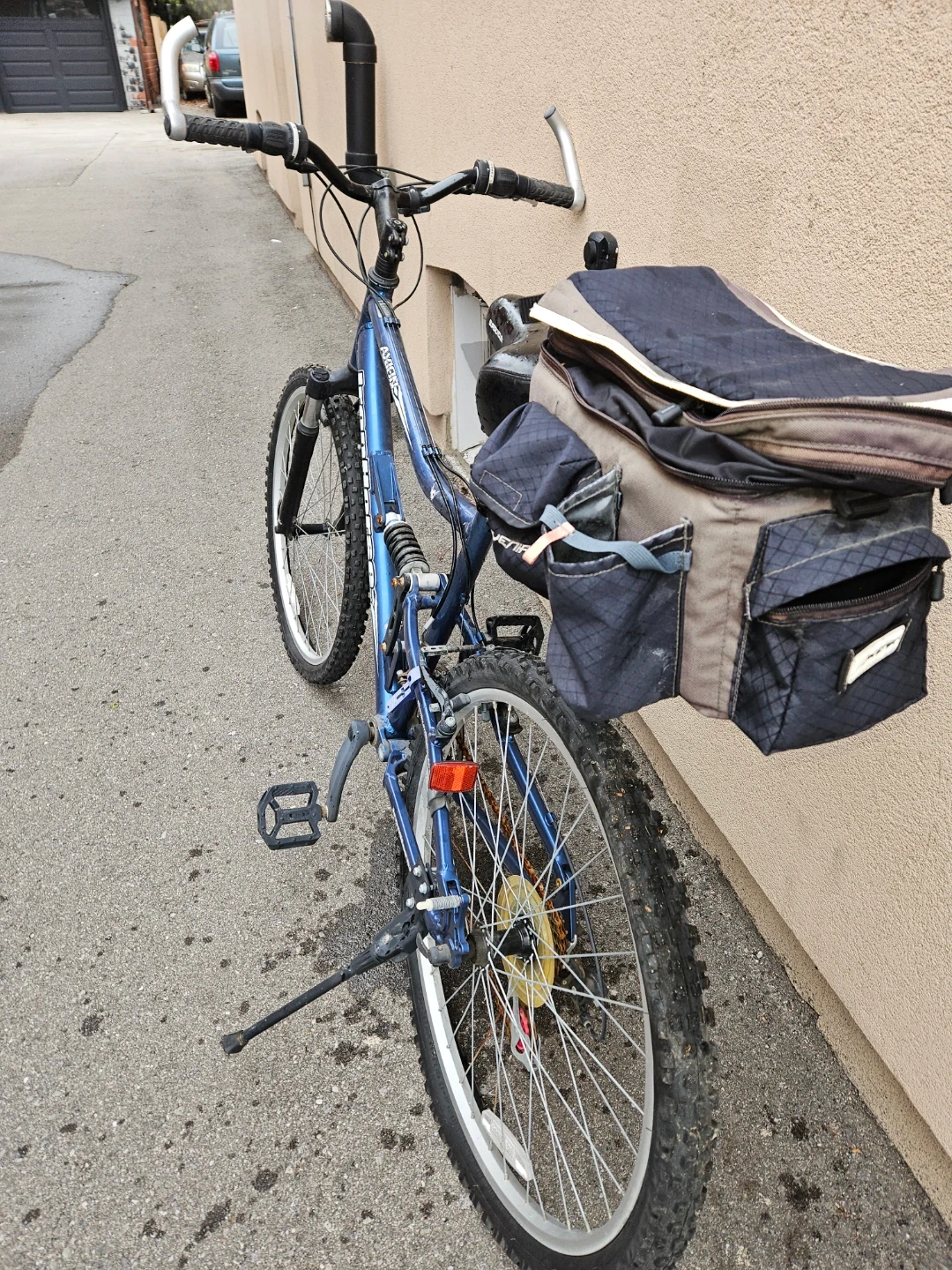 This is a blue Iron Horse Axion full suspension mountain bike. It comes with a rear saddle bag. Great for tackling trails!