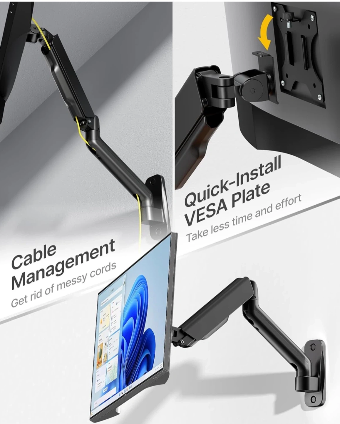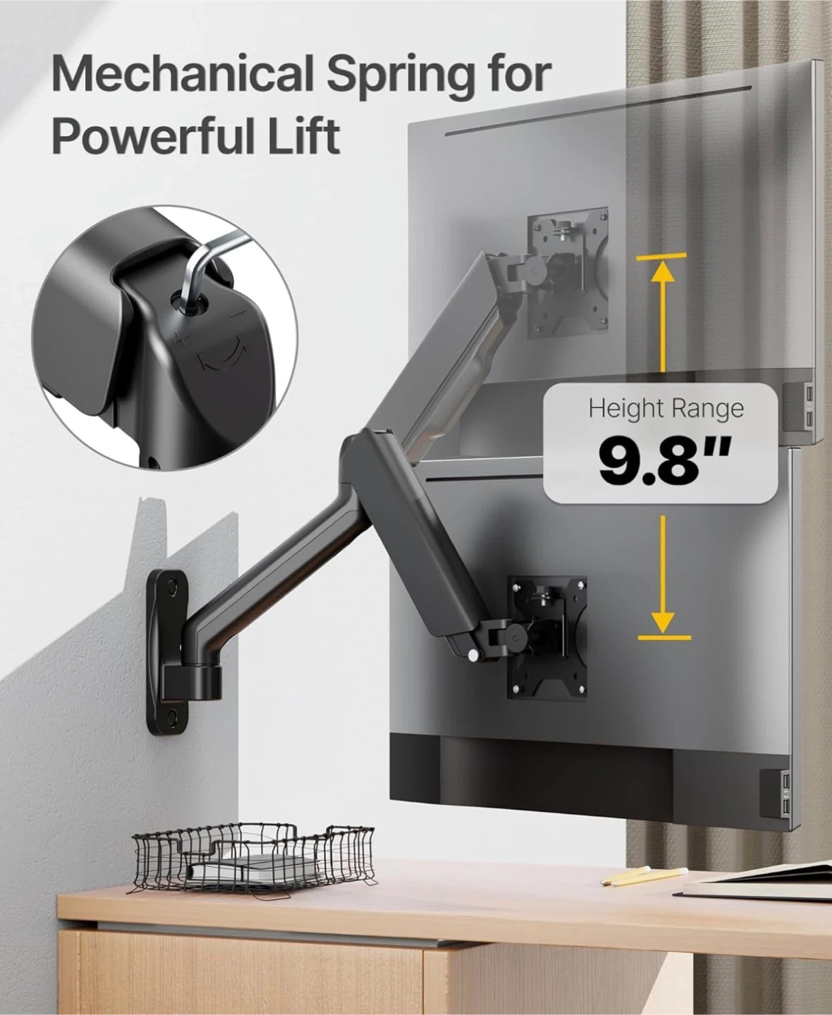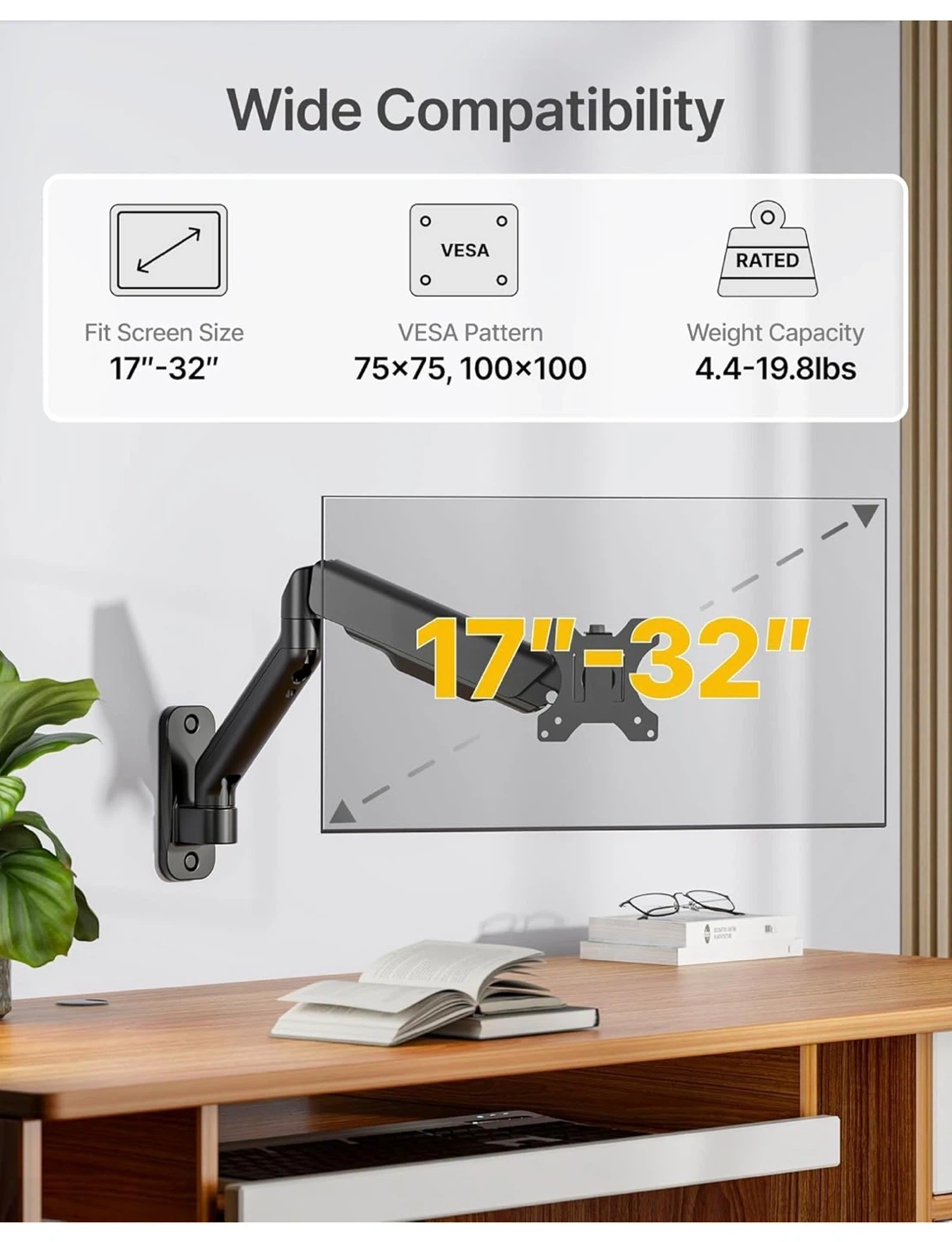This monitor wall mount supports screens 17"-32" with a weight capacity of 4.4-19.8lbs. It features a mechanical spring for lift, a height range of 9.8", and cable management. The VESA plate is quick-install and compatible with 75x75 and 100x100 patterns.