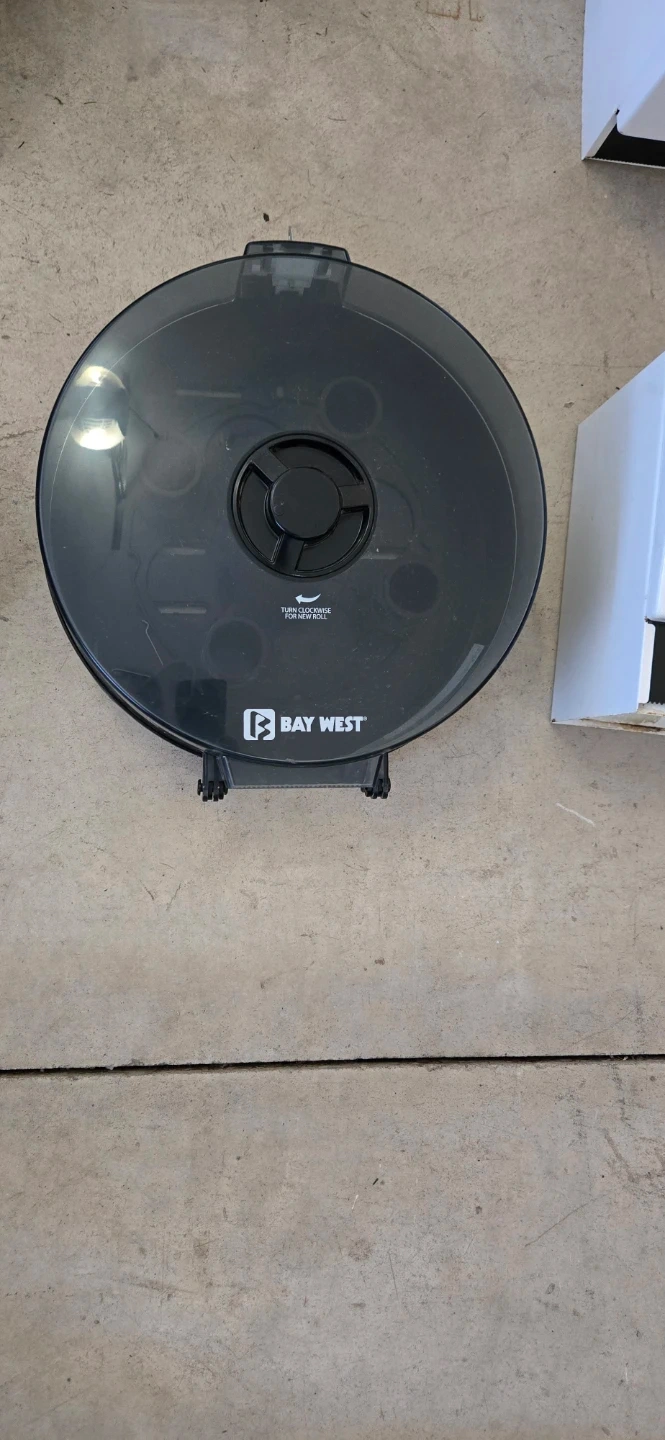 This is a Bay West black toilet paper dispenser. It's a durable plastic unit designed for commercial or high-traffic washrooms. Includes instruction for loading a new roll.