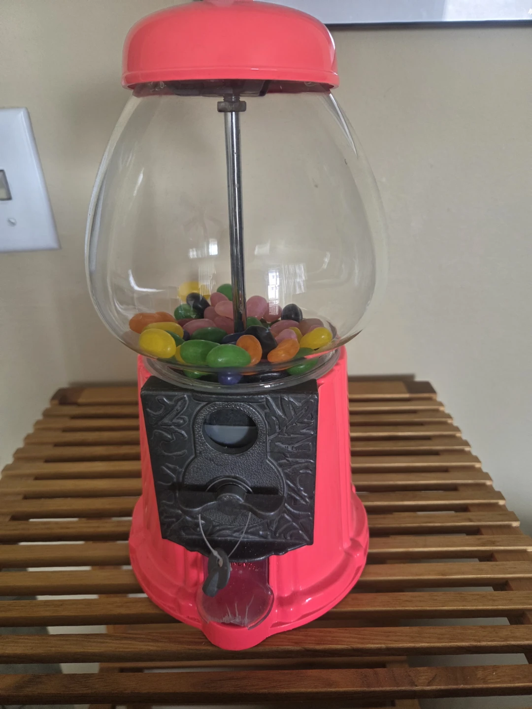 This is a bright pink gumball machine with a clear globe. It has a black dispensing mechanism. Comes with colourful jelly beans inside (they've been in there about 1 month)! Perfect for a fun treat dispenser.