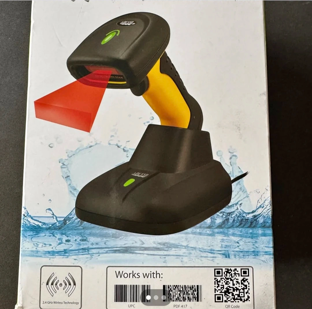 This is an Adesso 2.4 GHz wireless barcode scanner. It comes with a charging cradle and supports UPC and PDF417 barcodes. It's designed for efficient scanning.