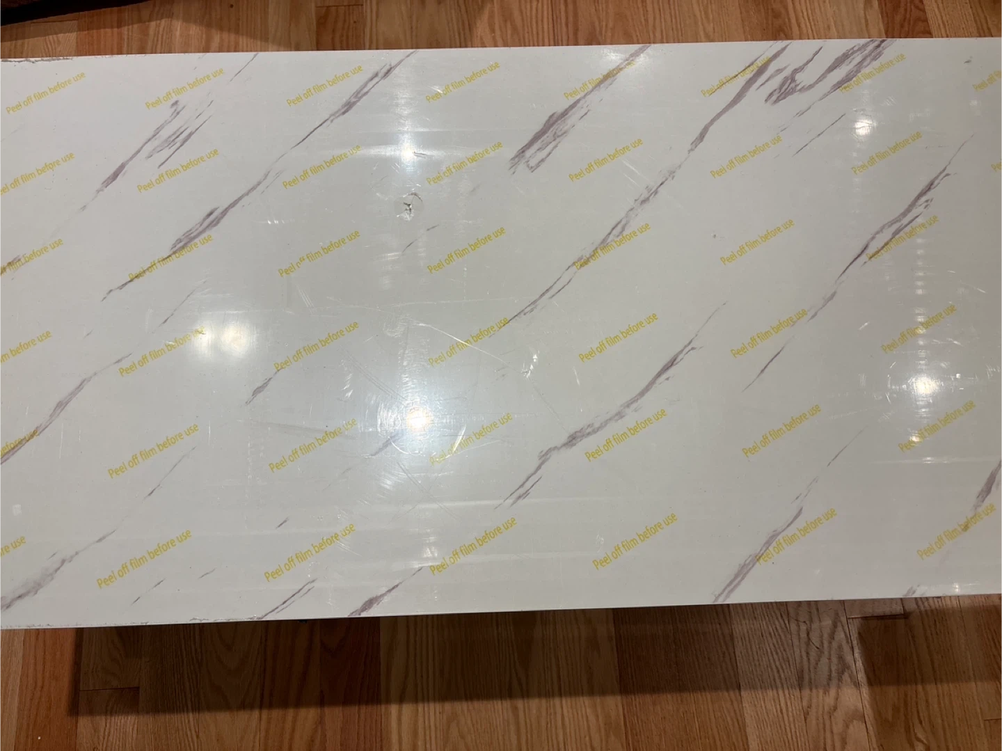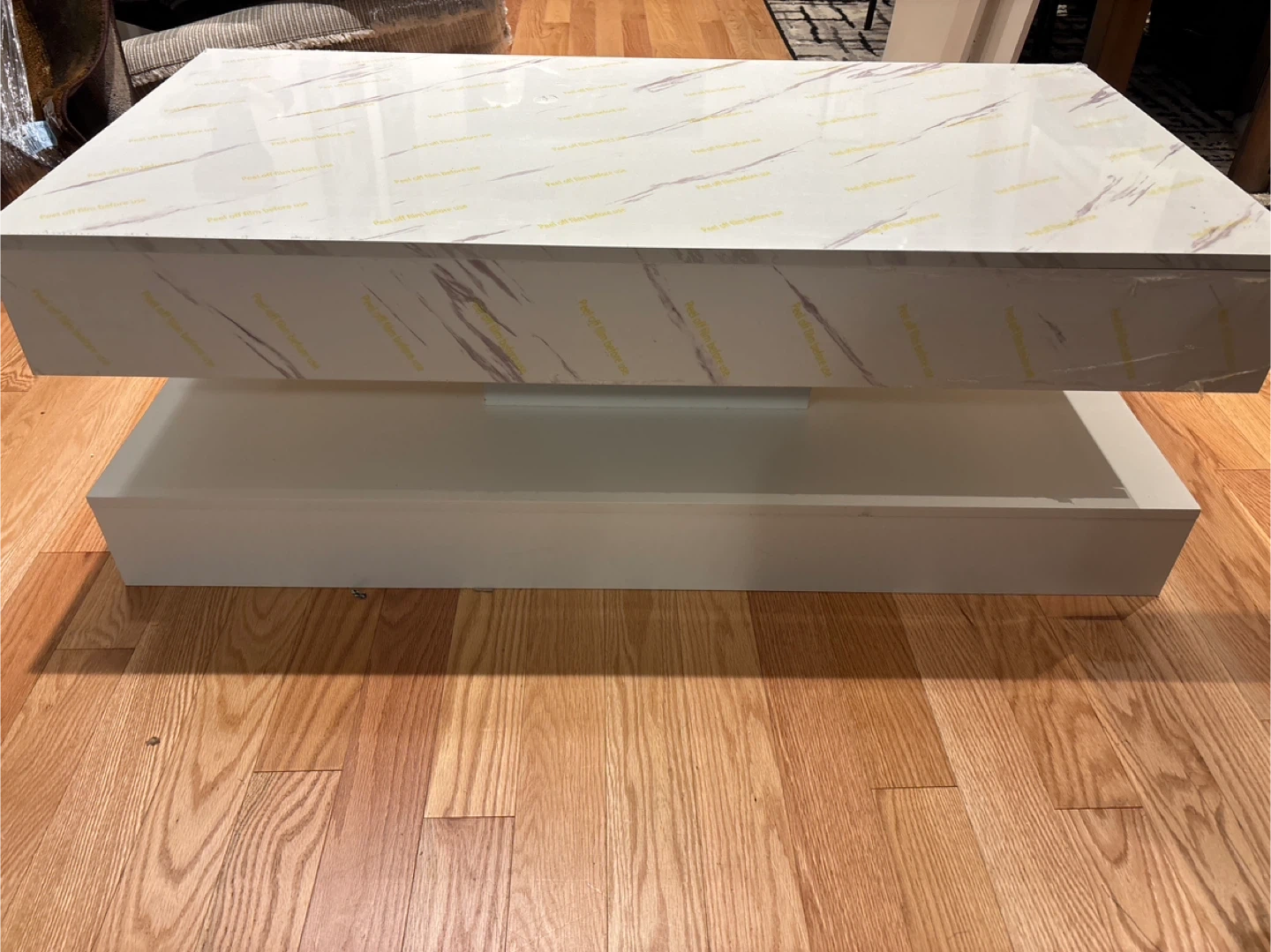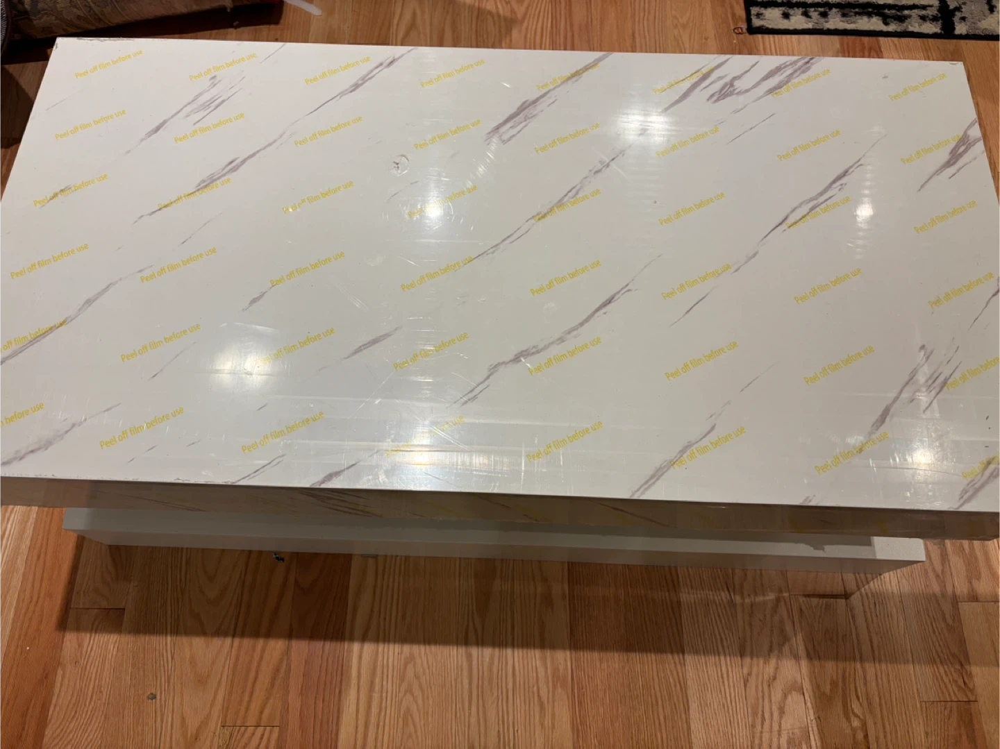This coffee table has a white marble-look top with a protective film that needs to be peeled off before use. It features a single drawer for storage. Great for a living room! It is brand new and has a little damage during assembling. It was bought from an auction site. Available for pickup and delivery.