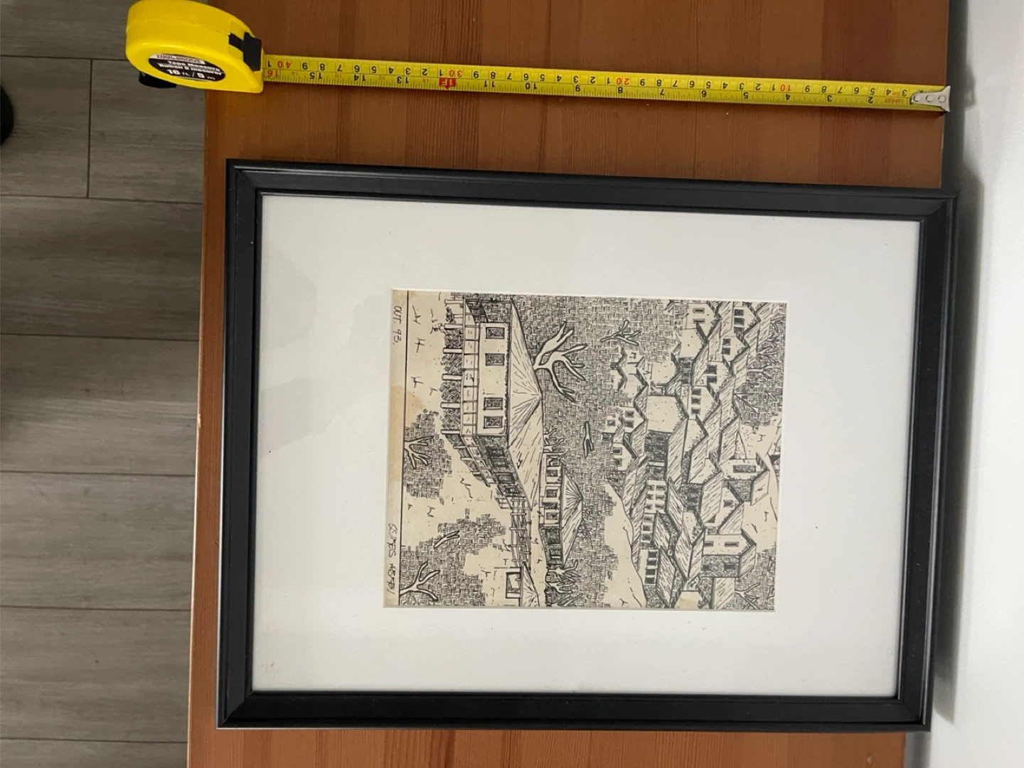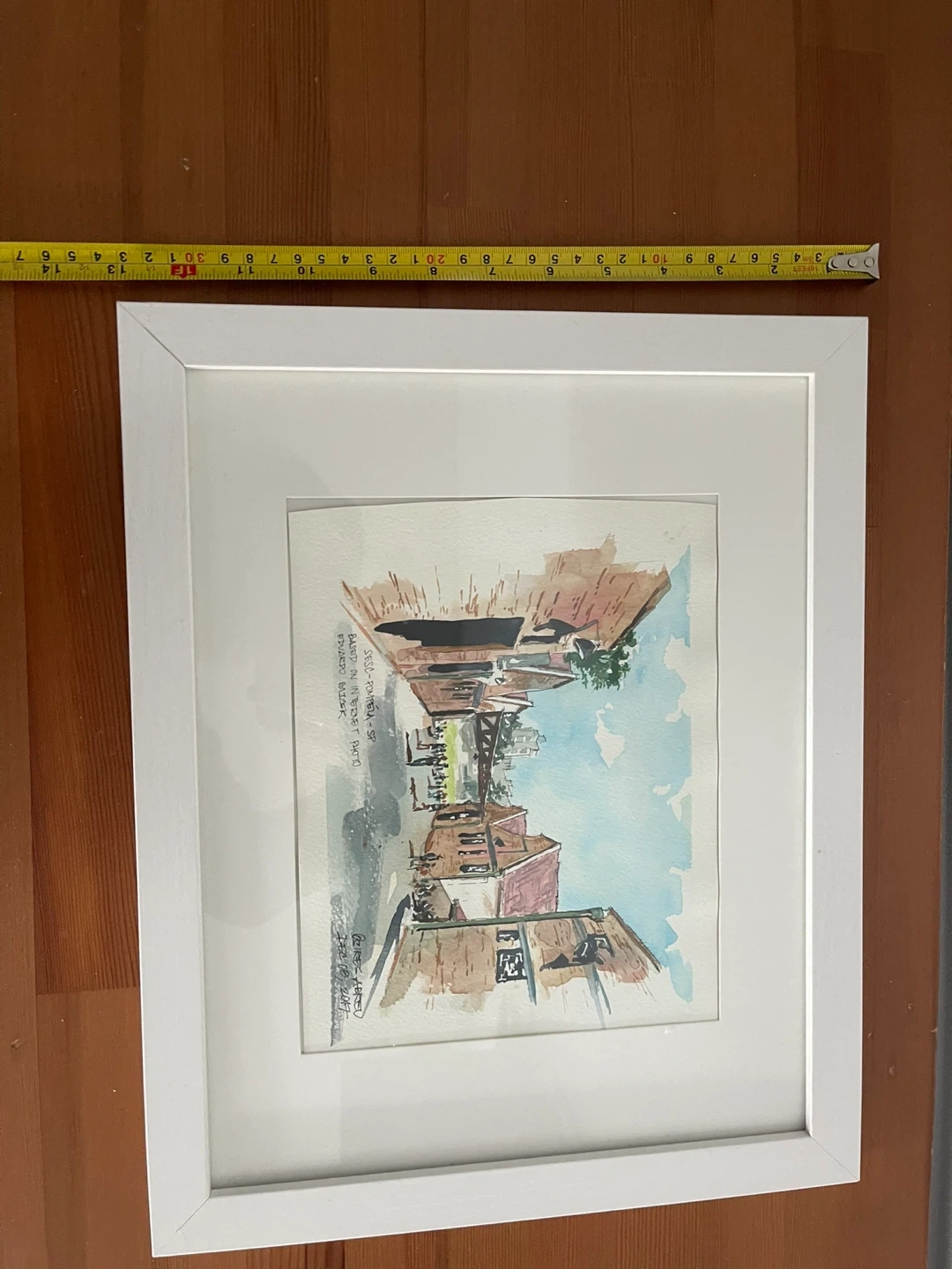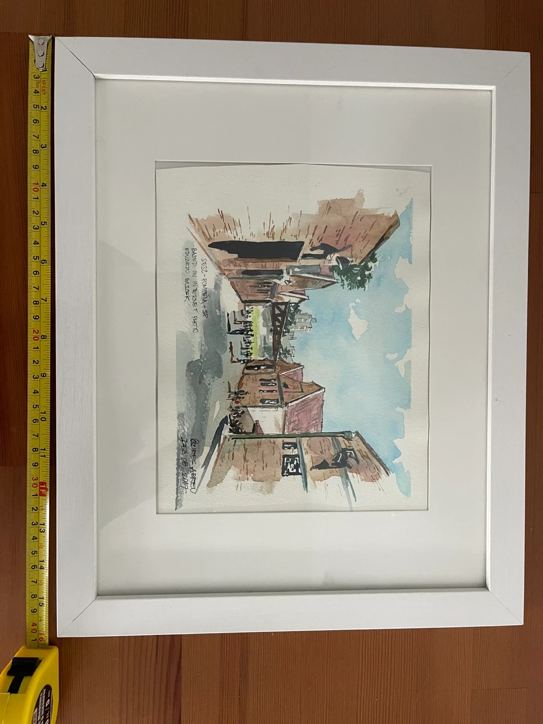 Framed watercolor artwork depicting building facades along a street. This piece measures approximately 8.5 inches by 11 inches, with the frame adding to the overall dimensions. It's a charming addition to any wall!