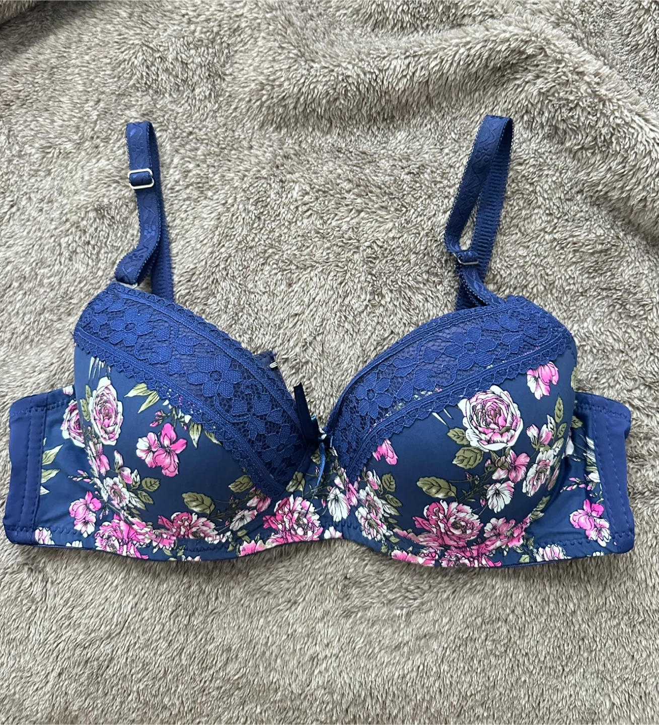 A lovely blue bra featuring a delicate floral print and lace trim.