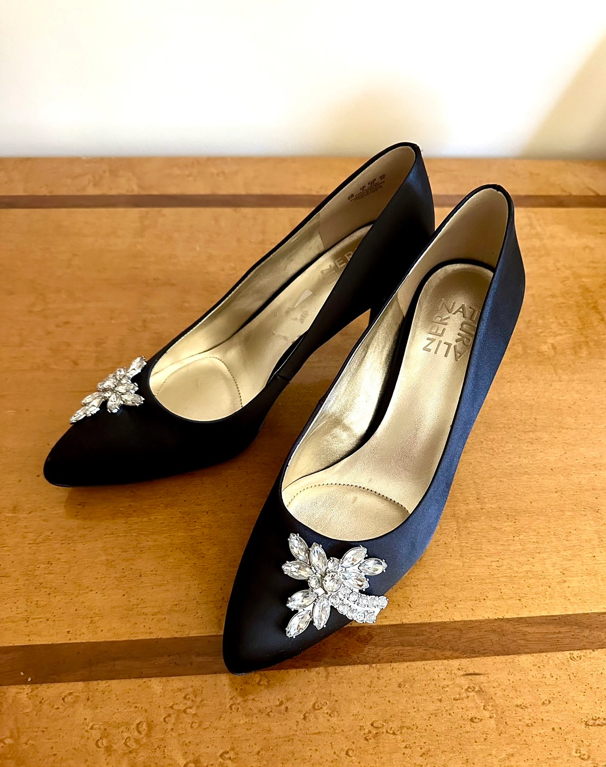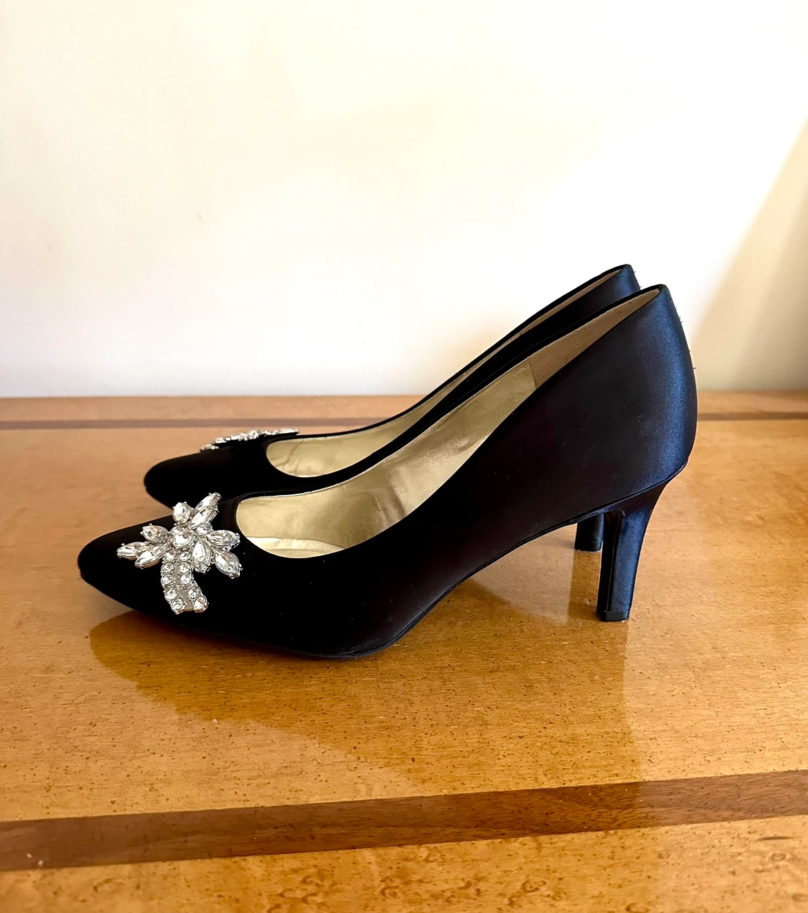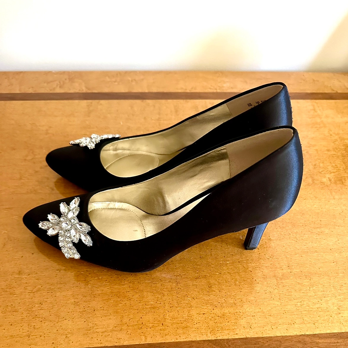 Brand new never worn evening/ office shoes. Black satin with white sparkling detail. Very Marilyn.