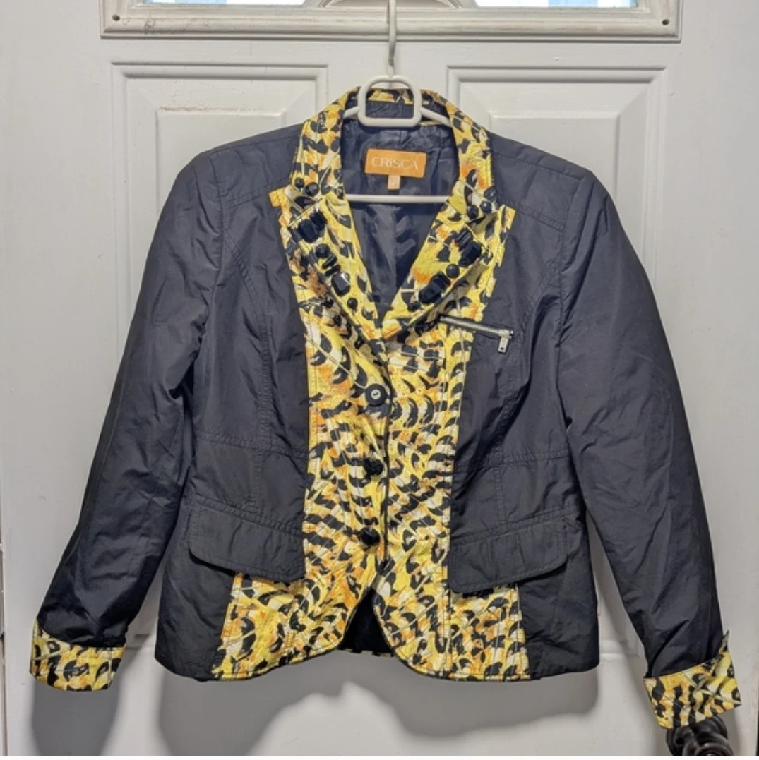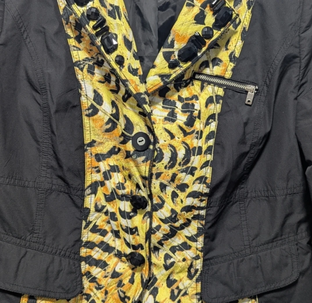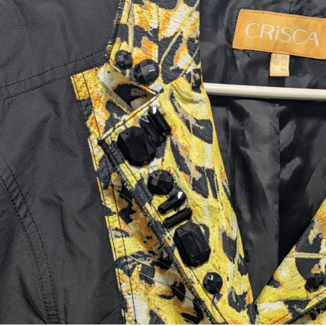 Stylish CRISCA blazer jacket. Features a black base with a striking yellow and black leopard print accent on the collar and cuffs. Embellished with black faceted gems on the lapels. Zipper and button closure with pocket details.
