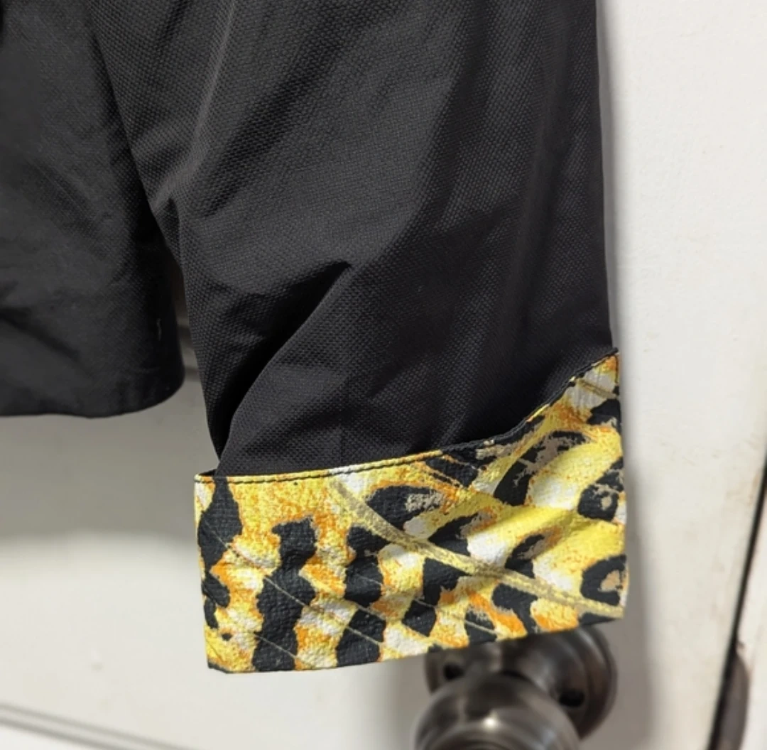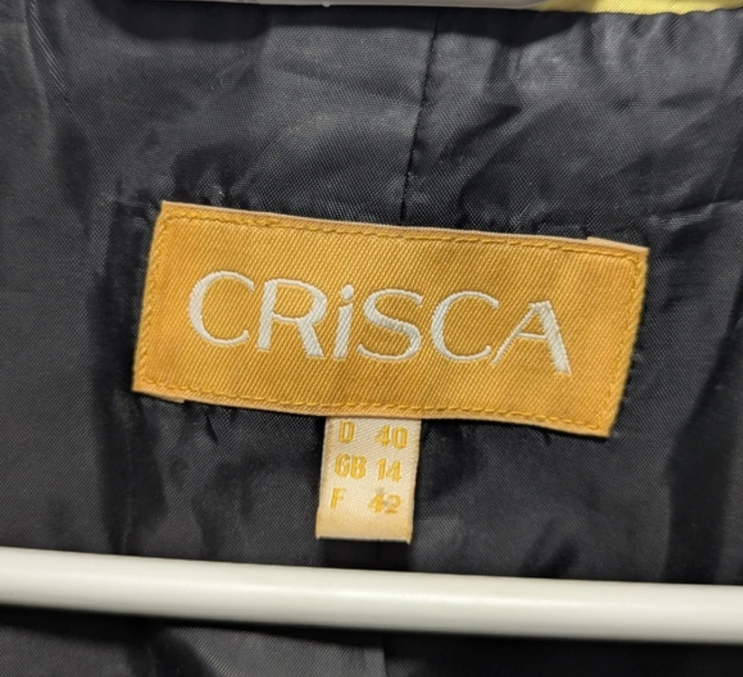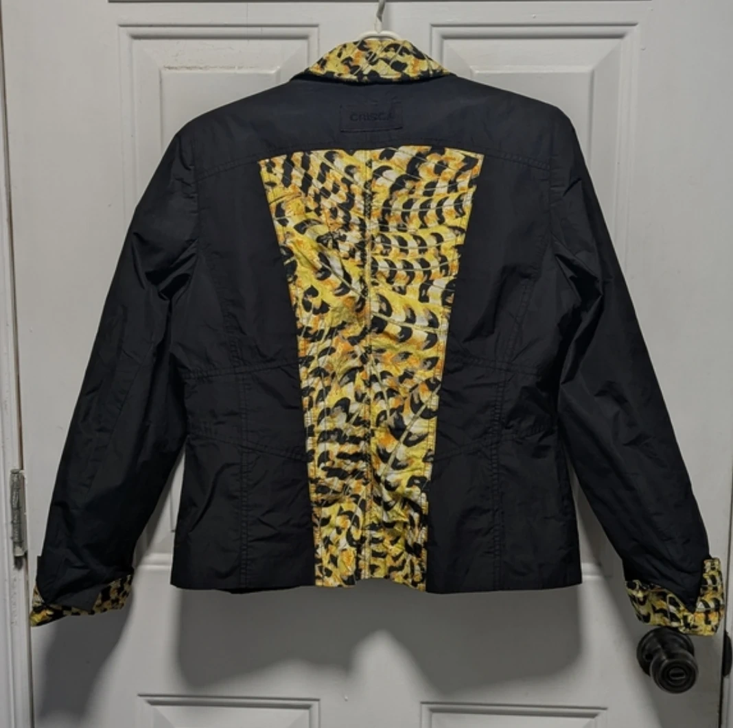 Stylish CRISCA blazer jacket. Features a black base with a striking yellow and black leopard print accent on the collar and cuffs. Embellished with black faceted gems on the lapels. Zipper and button closure with pocket details.