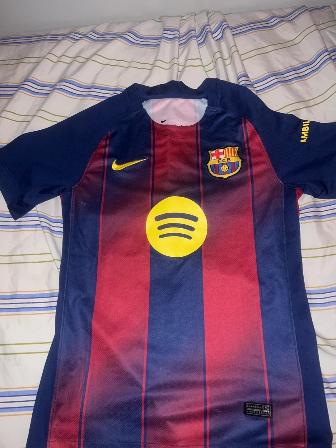 This is an FC Barcelona jersey with Lamine Yamal's name and number 10 on the back. It features the Spotify sponsor logo on the front. The shirt is made of polyester.