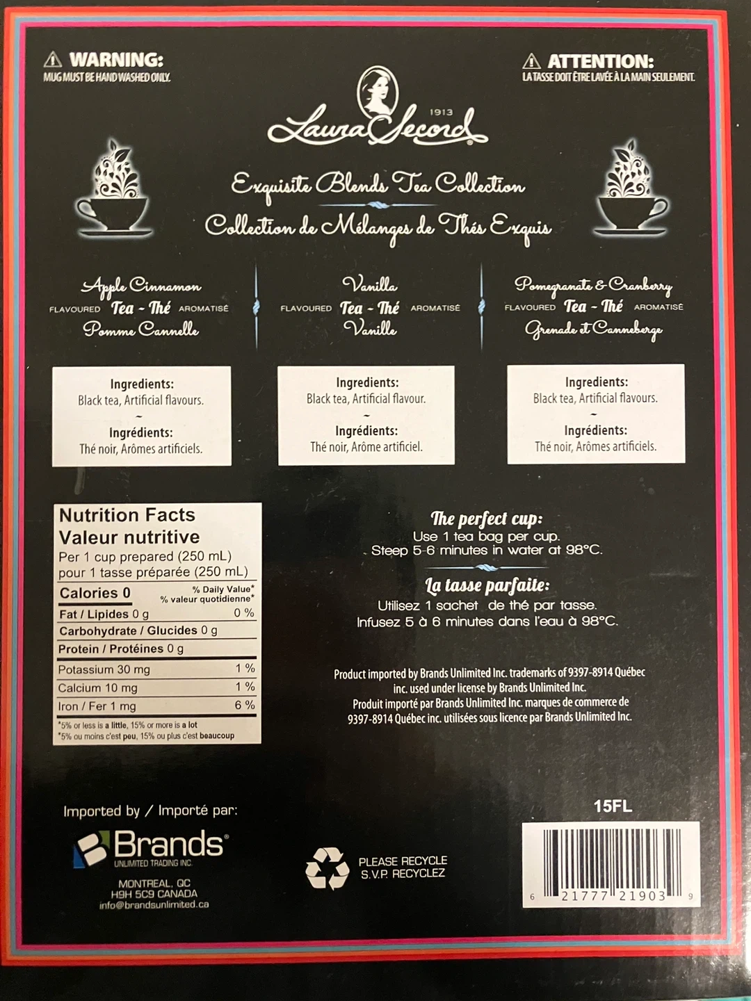 It includes a double glass travel container and three different flavoured teas: Apple Cinnamon, Vanilla, and Pomegranate & Cranberry.