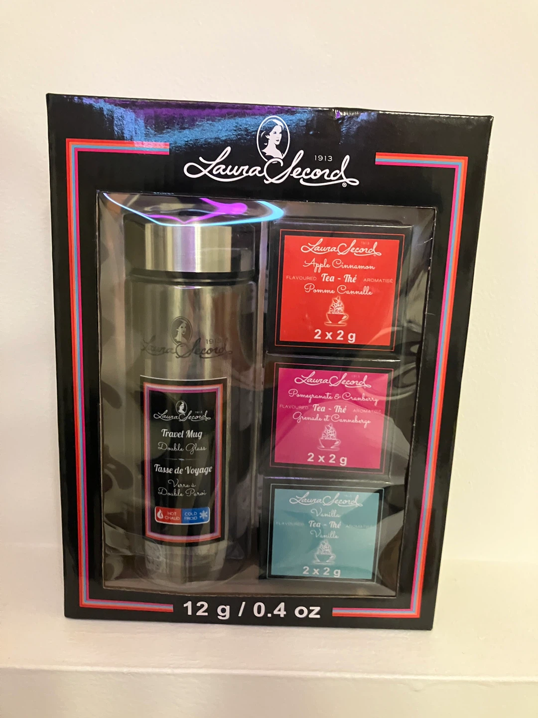 It includes a double glass travel container and three different flavoured teas: Apple Cinnamon, Vanilla, and Pomegranate & Cranberry.