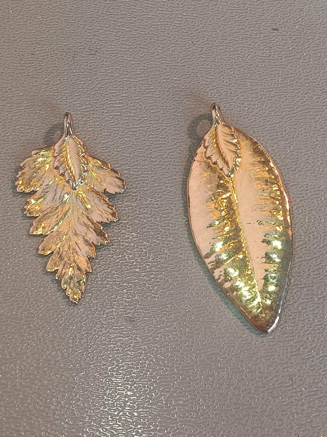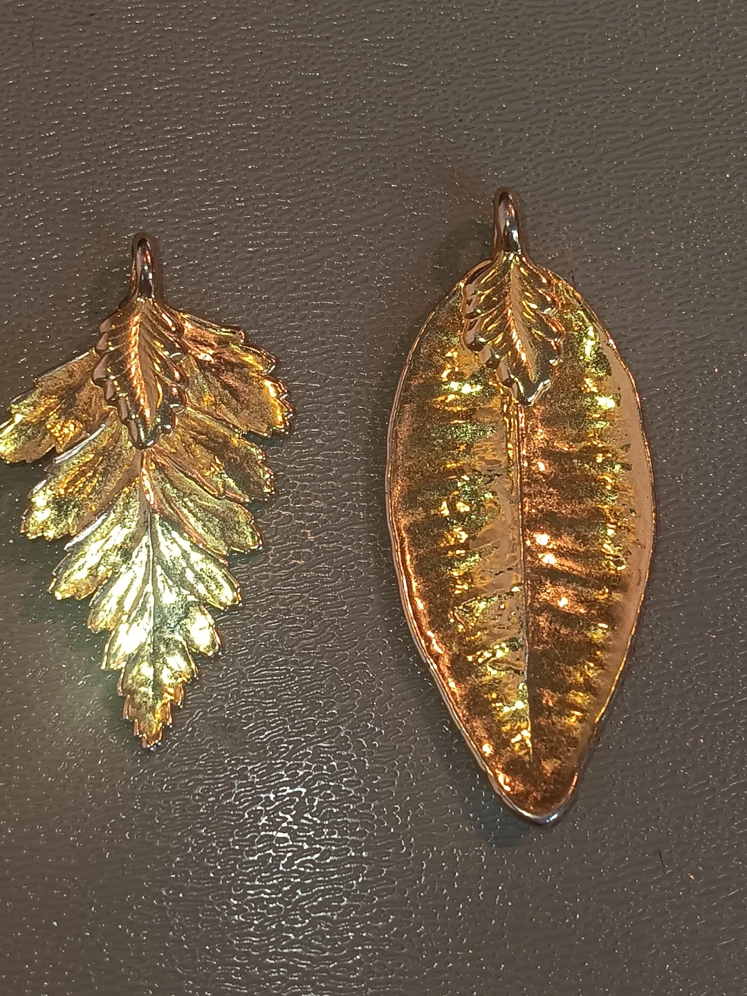 Two beautiful gold tone leaf pendants. One is a detailed fern leaf shape and the other is a smooth oval leaf shape. Both have a loop for attaching to a chain.$20 for both