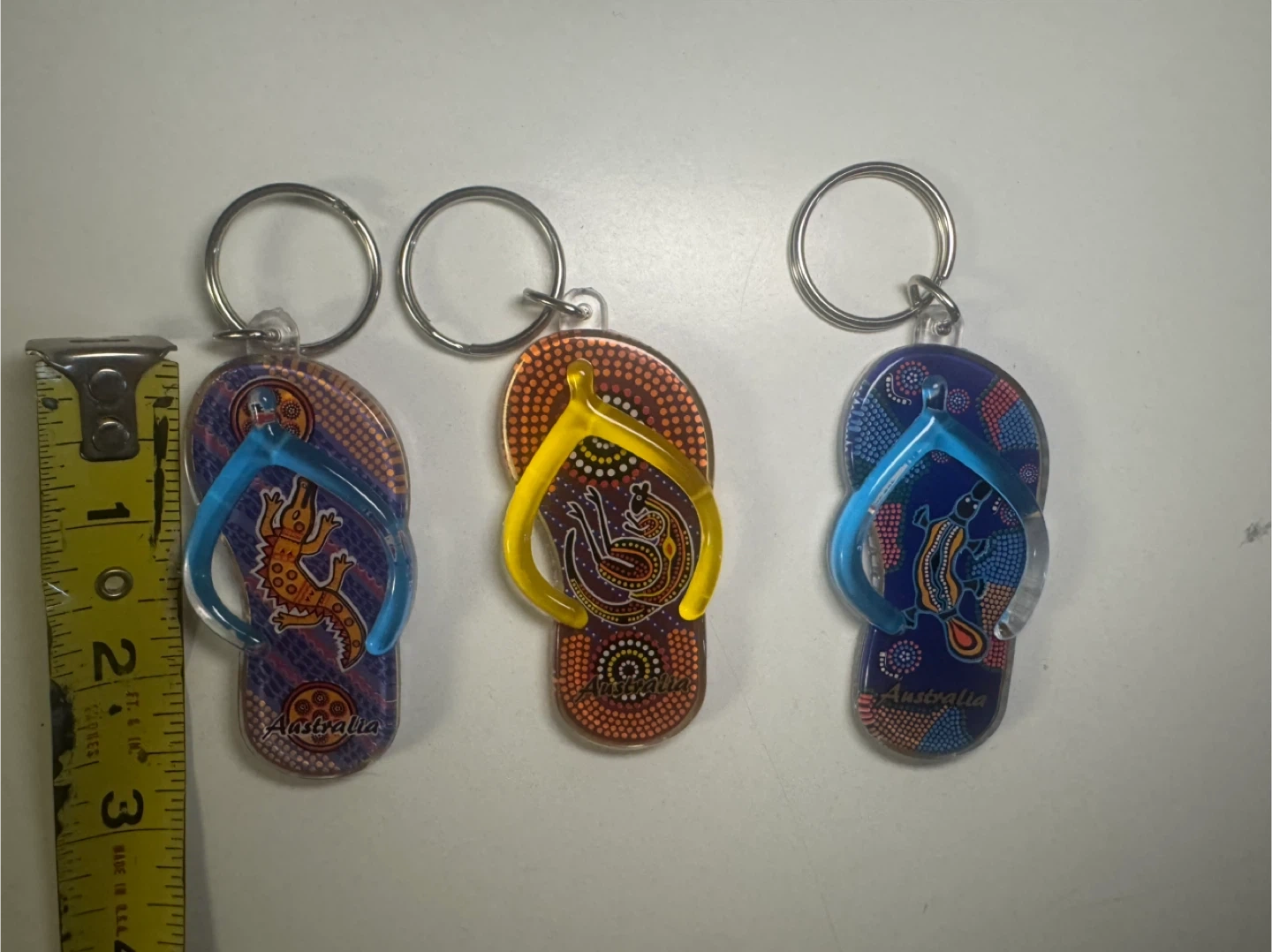 Cute souvenir keychains featuring aboriginal art designs and Australian animals. Each keychain is shaped like a mini flip-flop or Aussie ‘thong.’ Attached to a silver keyring for easy attachment to keys or bags. Perfect for travellers, beach lovers or as a memento!