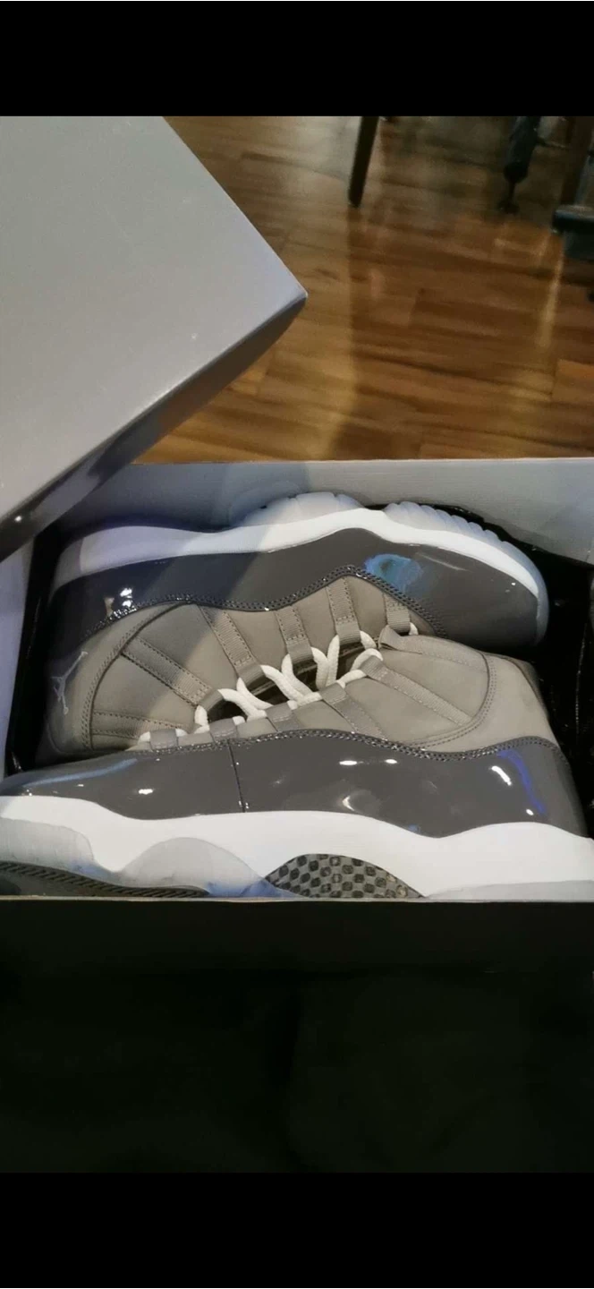 These Air Jordan 11 Retro sneakers are in the 'Cool Grey' colourway. They feature a patent leather mudguard and a synthetic upper. Included is the original box. Size 8.5 bought them in metro town at the lab