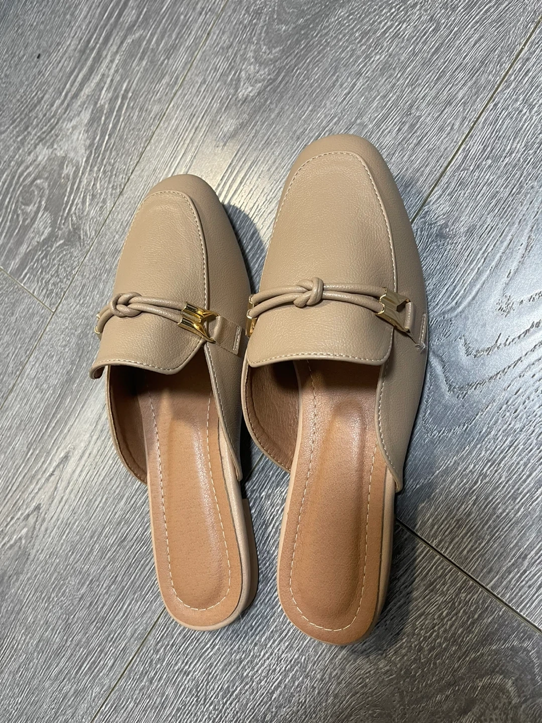 women's beige mules feature a chic knotted detail with a gold accent. They're slip-on style for easy wear. Made from a faux leather material. Size is 41. Brand new and never worn