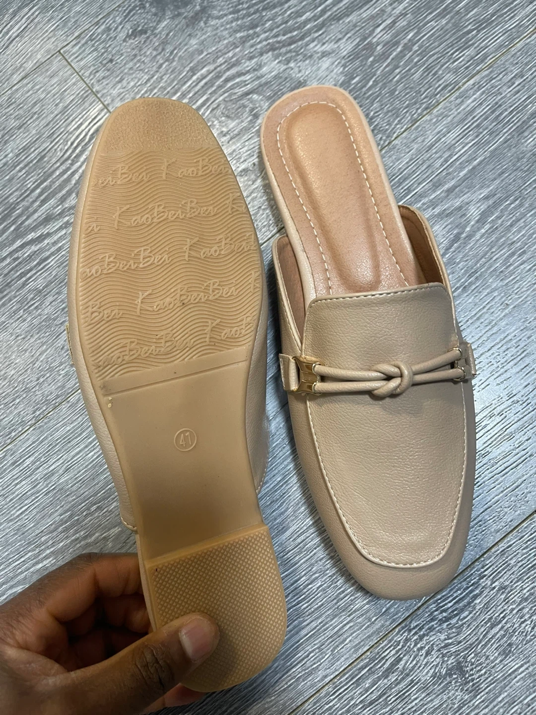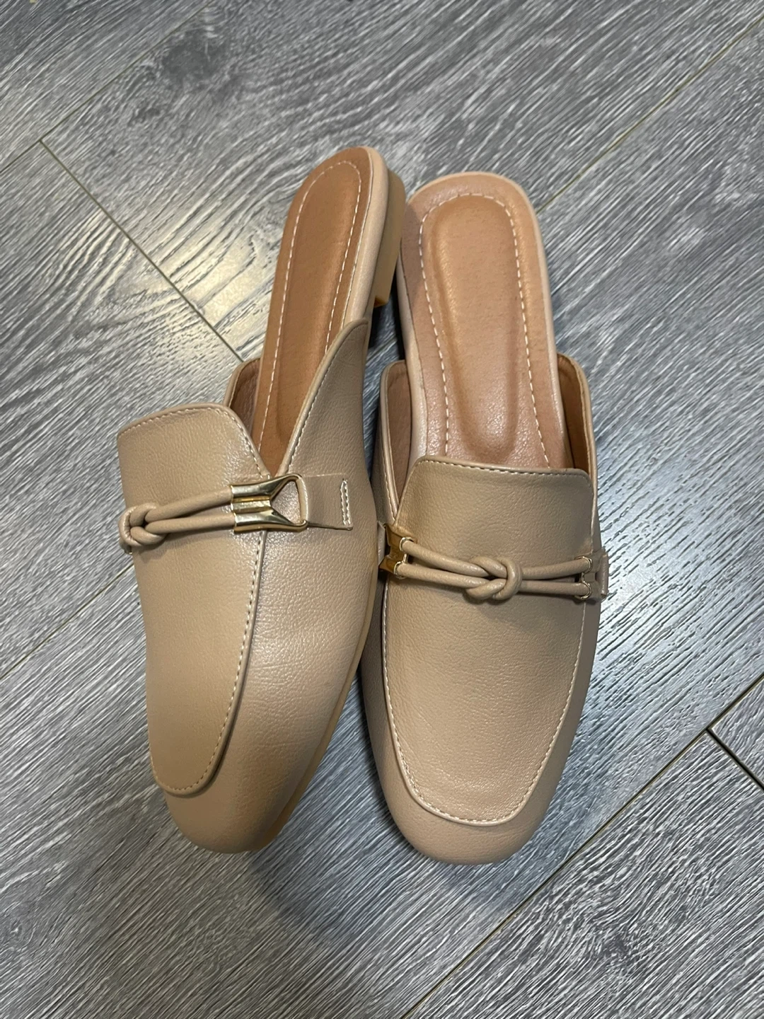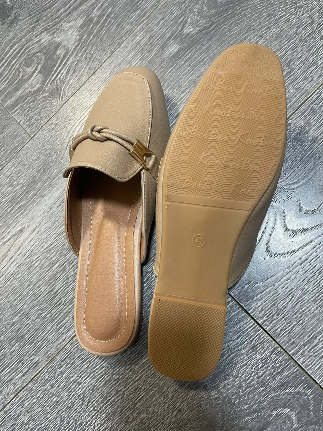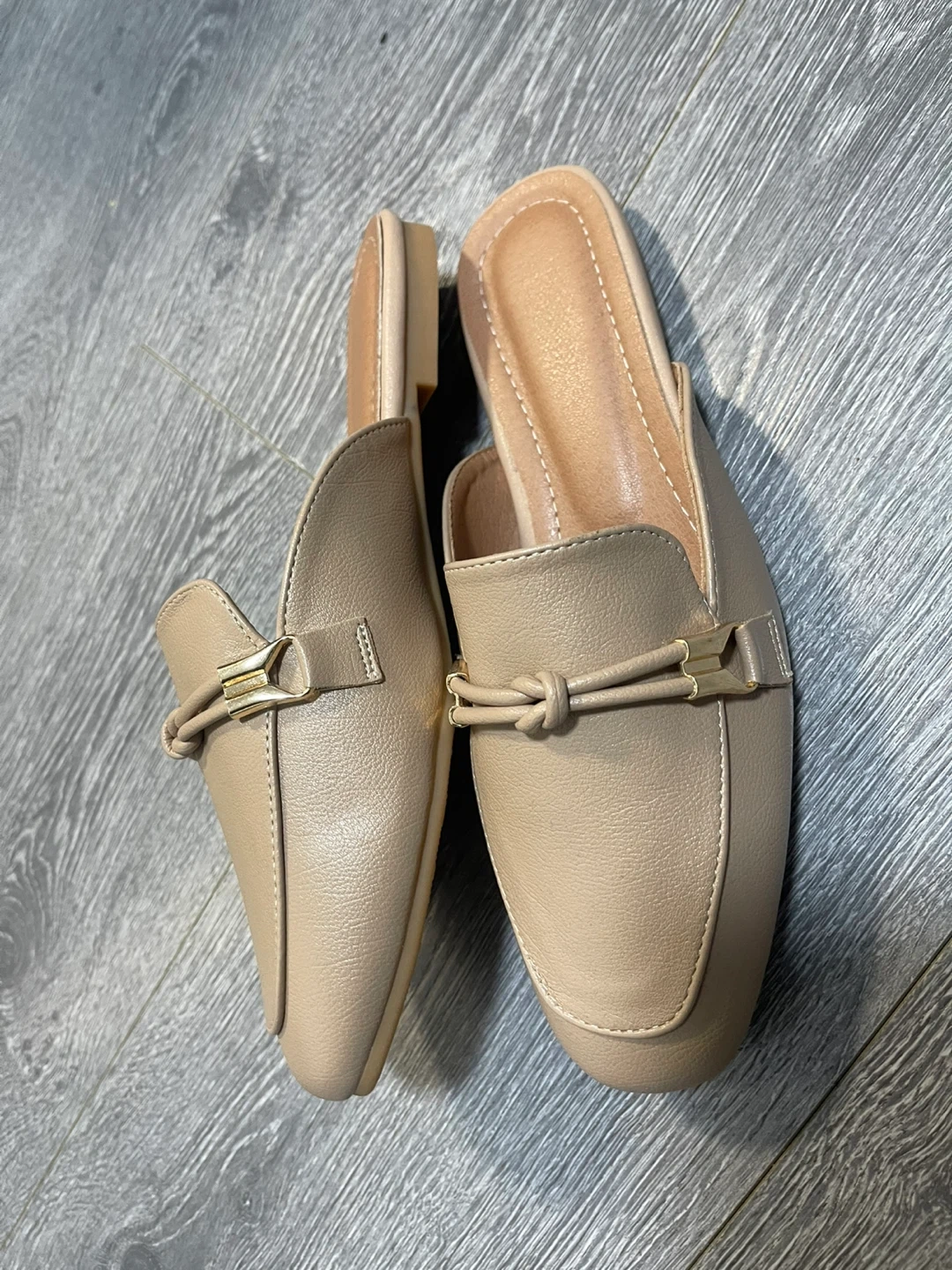 women's beige mules feature a chic knotted detail with a gold accent. They're slip-on style for easy wear. Made from a faux leather material. Size is 41. Brand new and never worn