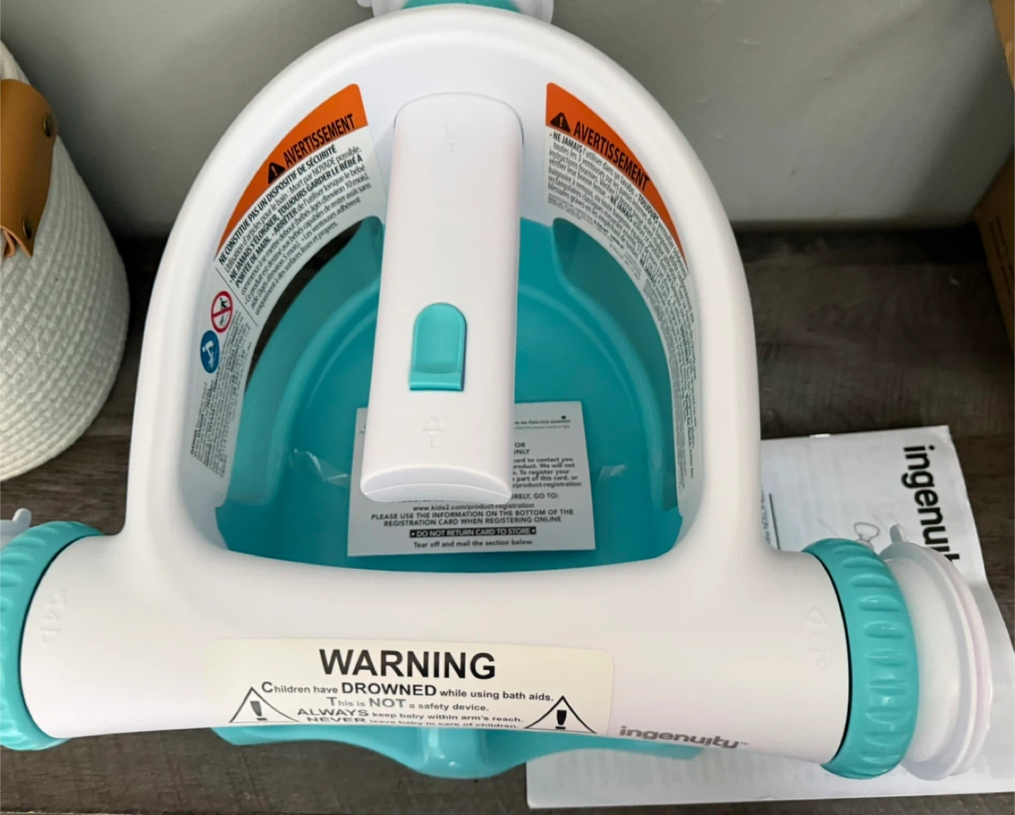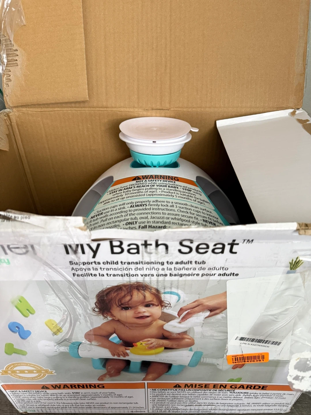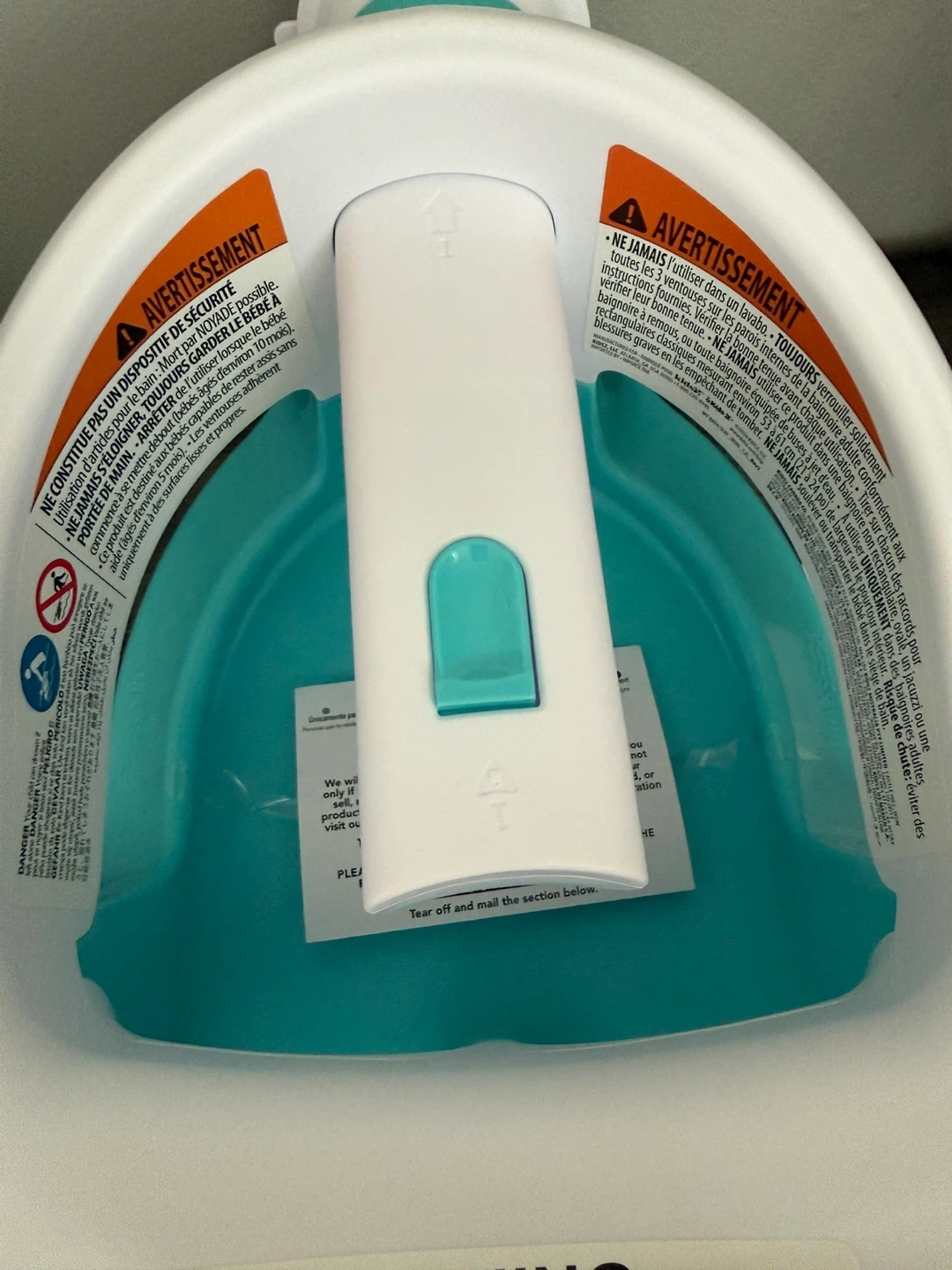 brand new. This bath seat supports child transitioning to an adult tub. It's white and teal with adjustable arms. Easy to clean and store.