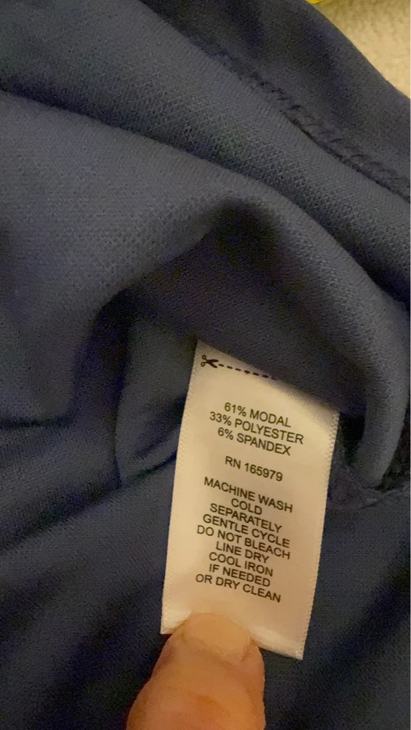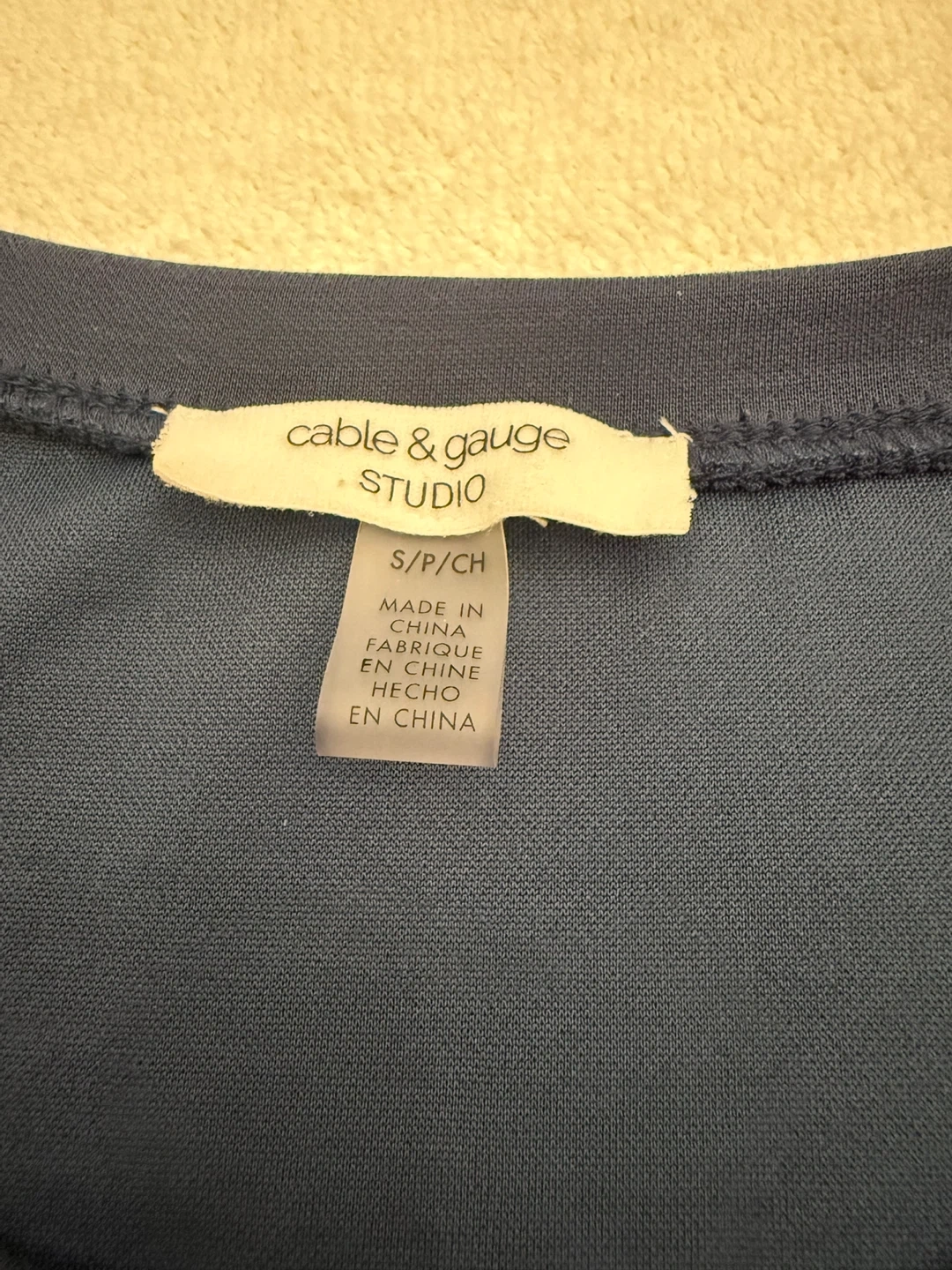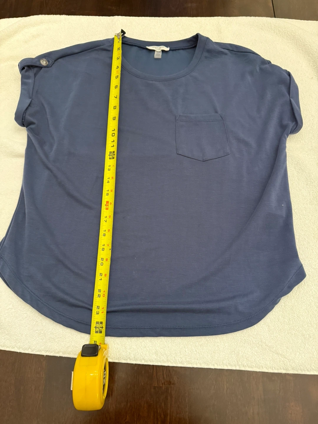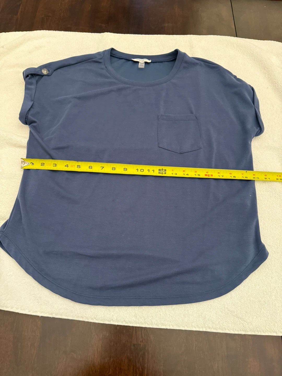 Women's navy blue t-shirt by Cable & Gauge Studio. Made from 61% Modal, 33% Polyester, and 6% Spandex. Chest measures 19 inches, length measures 23 inches. Features a single chest pocket and decorative buttons on the shoulder. Never worn.